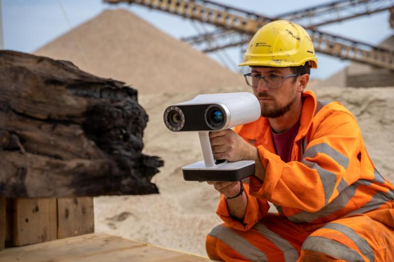 archaeologist in full PPE laser scanning remains of a shipwreck in a quarry