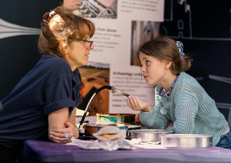 archaeologist at a table with a child exchanging earnest looks over environmental samples