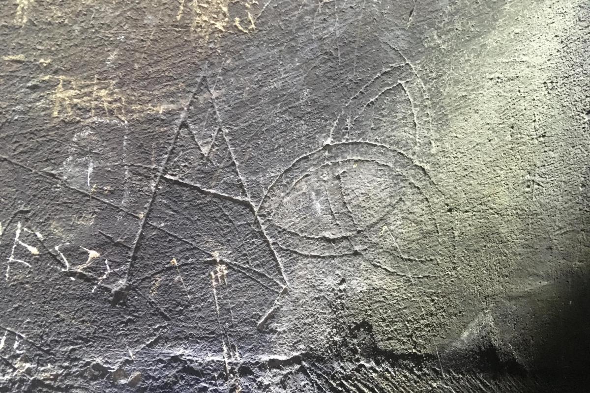 Further marks have also been discovered amongst large amounts of historic graffiti in the north-east stair turret. One distinctive design here stands out, it has been carved into the top of the stone doorway and has a very distinctive design consisting of three arcs forming what may be interpreted as a Celtic knot. This may be a ‘cross-over’ design with the religious connotation of the ‘Holy Trinity’, but also functioning as a protective mark.