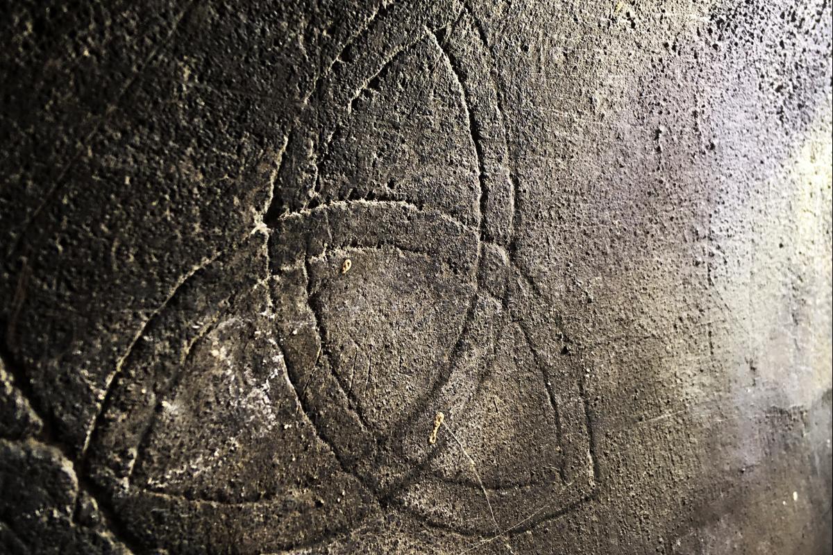 Further marks have also been discovered amongst large amounts of historic graffiti in the north-east stair turret. One distinctive design here stands out, it has been carved into the top of the stone doorway and has a very distinctive design consisting of three arcs forming what may be interpreted as a Celtic knot. This may be a ‘cross-over’ design with the religious connotation of the ‘Holy Trinity’, but also functioning as a protective mark.