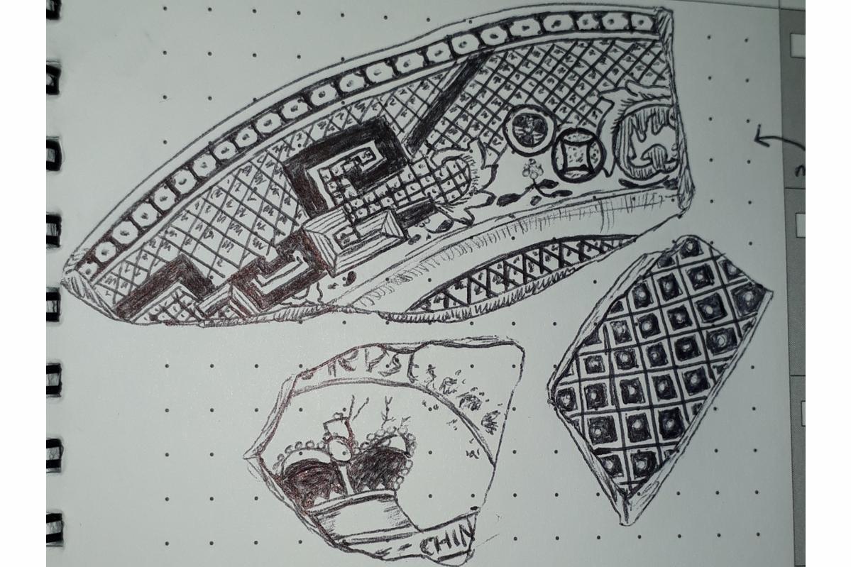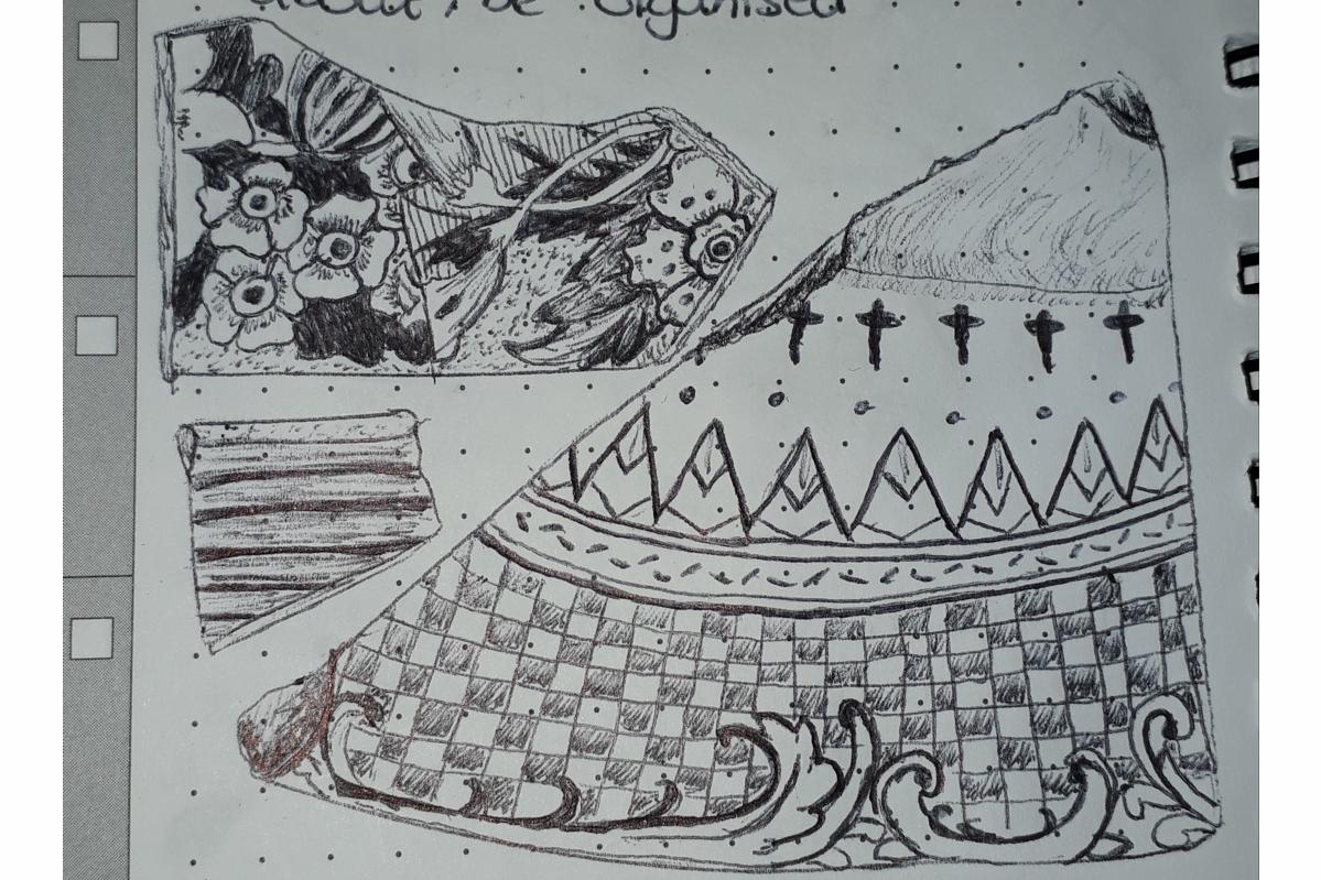I keep a site notebook that I update daily with drawings, notes and artistic impressions of the work I have been doing. Being in the office gave me the opportunity to practise drawing finds, so each night I drew three bits of pottery. Site books are a great way for me to develop an understanding of the site I am working on – it makes me think about what I am doing and brings a narrative to my work.