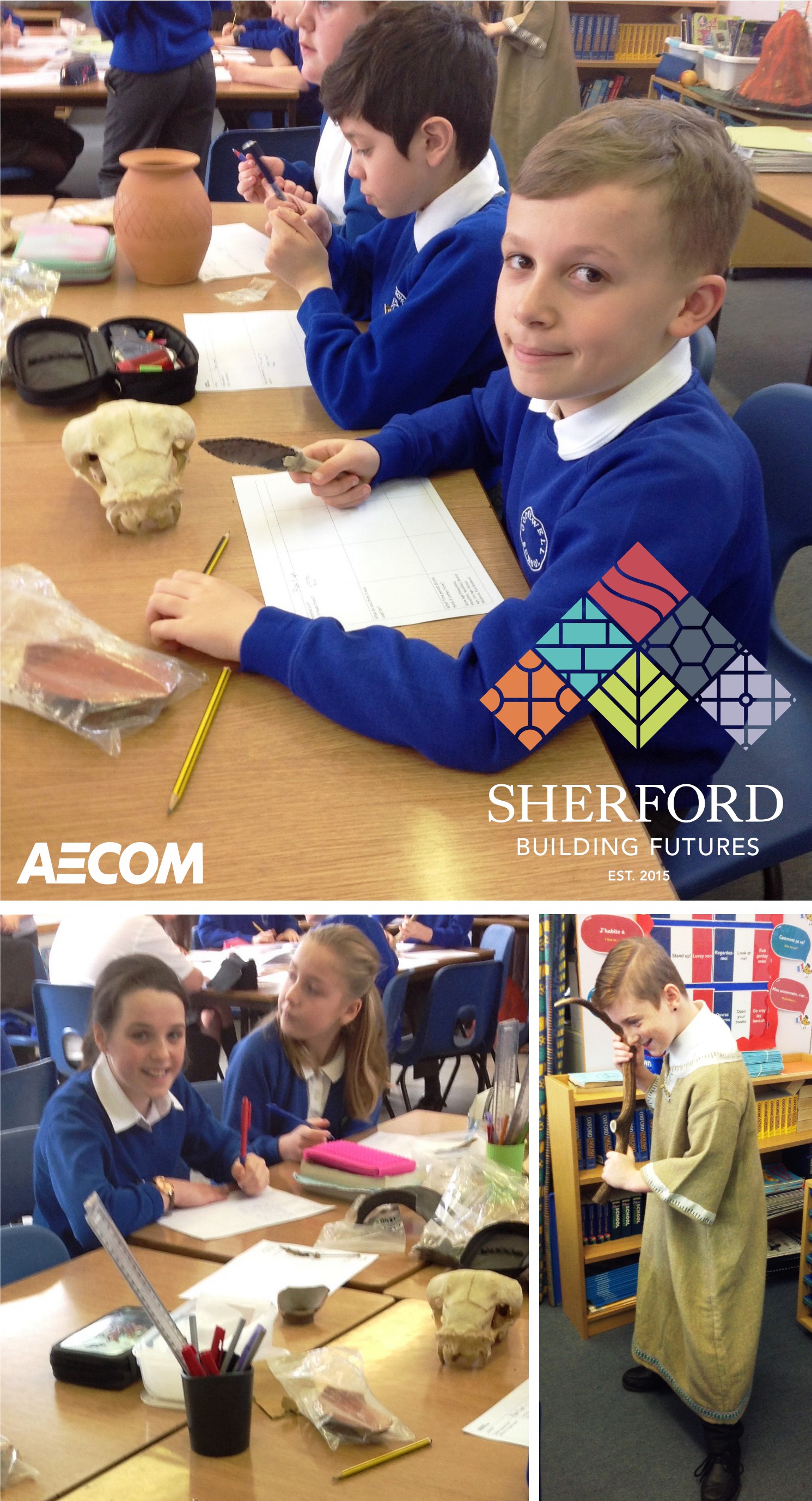 Rachel worked with Year 6 and Year 3 students at Goosewell Academy. The Year 6 students investigated artefacts that had been found at Sherford, to discover what can be learnt from the finds about the people who had inhabited the land over the last c. 8000 years. They also looked into the Bronze Age round barrows discovered on site, which deepened their understanding of prehistoric activity at Sherford. The lesson allowed the students to learn about their local environment, how landscapes change over time, and also supported the National Curriculum work they will be doing in the summer term based around prehistory. The Year 3 students also learnt about finds from the site and discovered how the archaeologists at Sherford conducted the excavation, this linked to earlier work the Years 3 students had been doing on archaeology.