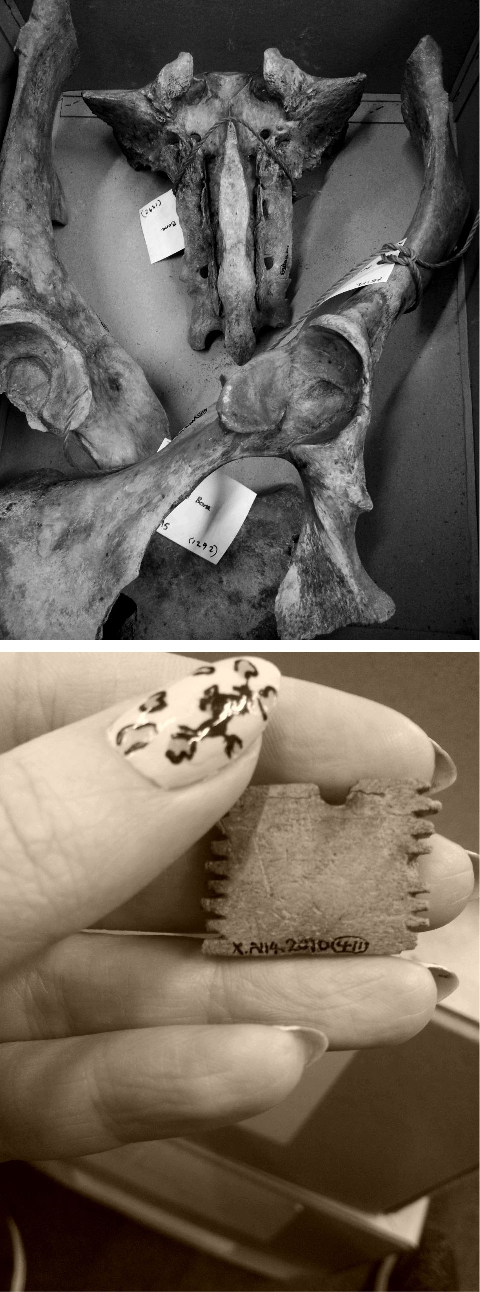 So the first full week in August sees our deadline for deposition of no less than five projects (in Week 3 it was only three projects but like tribbles they somehow keep multiplying). The projects vary in size from a couple of small finds to boxes and boxes of animal bones, worked bone and pottery, so my work on preparing each of them is certainly cut out! The biggest project has three boxes of documentary archives and a whopping eight boxes of finds and this week I have been focusing on those eight boxes. Going through the finds and marking them off the database may sound like a laborious endeavour but I would have to disagree; when you open up each finds box and handle the objects inside you can almost pretend that you’ve broken through the fourth wall of some history documentary. However when my Attenborough skills of deduction fail me, I’m always really impressed when I ask someone in our office what the piece of pottery is/was in my hand and from that sherd they can ascribe a rough date and the actual shape of pot itself. The best things I’ve found in boxes this week has been the huge sacrum and pelvis (cow or horse) from the 18th–19th century and a toothplate from a double sided, composite comb which is a characteristic Saxon type.