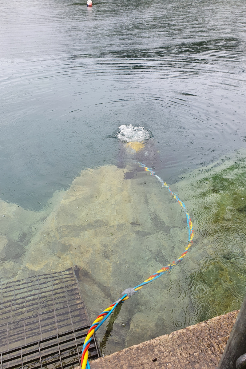 During the days where surface supply diving was practised, I was a tender, which is a person on the surface that holds the umbilical of a specified diver. As the supervisor is in constant communications with the divers in the water, on request, we hold their umbilical steady, take in their slack or give them more slack depending on the task or drill being carried out under water. Surface supply diving is used when sites are deeper as it allows more time underwater for the diver. Having a constant connection with the surface is also very useful when visibility is low, or a site is potentially more hazardous.