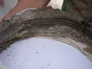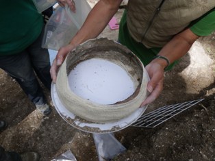 The most exciting archaeology of the week however, came from the Early Bronze Age barrow in the form of the two urned cremation burials. Excavation of these showed that both pots (Collared Urns) had been inverted on burial. The first of these was fully excavated and lifted on site, a delicate process involving the quadranting of the contents and regular recording. This patience was rewarded in revealing coiled decoration on the interior of the vessel. Excavation also began on the second of these urned cremation burials, with this vessel being almost complete, a rare discovery that caught everyone’s interest.