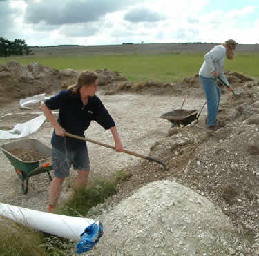 Then finally the task of backfilling, the cause of many an aching muscle. All the excavated features were refilled with soil. Those such as the ditch and quarry hollow, which may be continued next year, have been lined with a special fabric to help protect them, and to prevent any cross contamination from the soil of the back-fill.