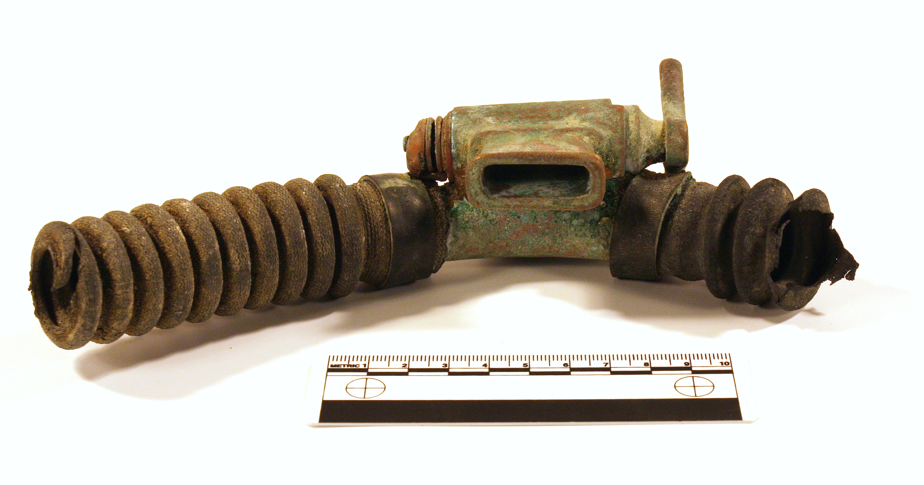 Best Find – Underwater Swimmers’ Breathing Apparatus (Bedhampton Wharf, Tarmac) – a brass mouthpiece with twin rubber hoses manufactured by Dunlop, and used by Naval clearance divers during the Second World War. The find was discovered at the wharf in a cargo dredged from Area 372/1, located east of the Isle of Wight.