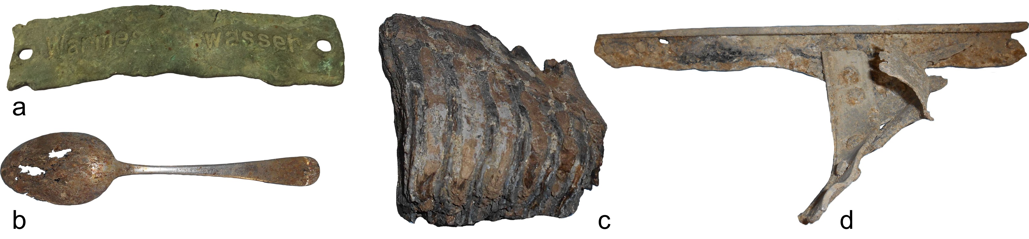 a: German hot water plaque, b: Spoon, c: Mammoth tooth d: Aircraft frame or stringer