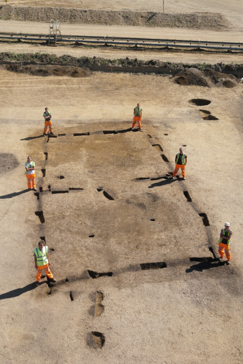 archaeologists standing by the 6 postholes around the foundation ditch of the house