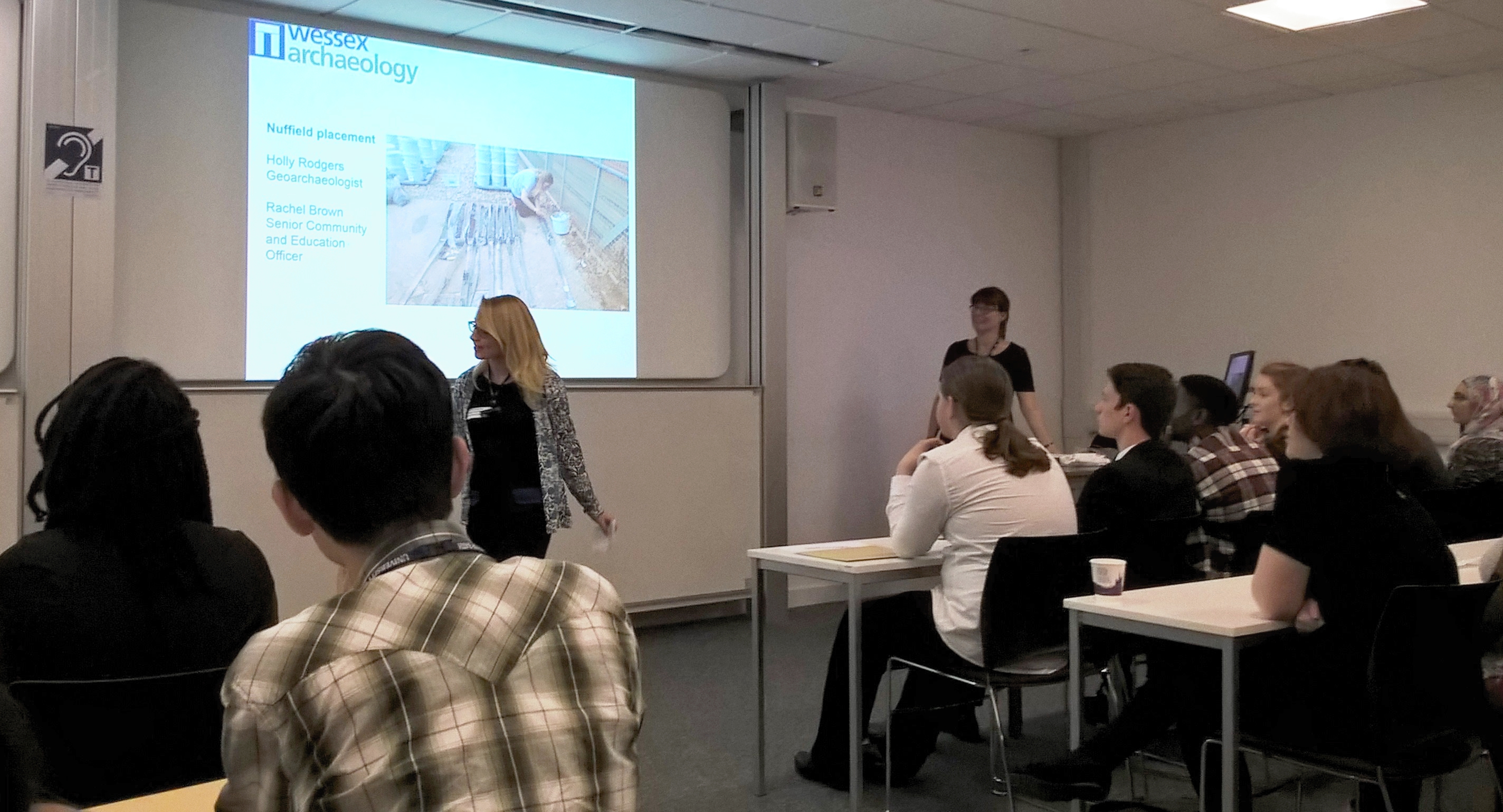 Last night the University of Bath hosted a celebration event for the students who participated in the Nuffield Research Placement Scheme in the South West region. Holly Rodgers, Geoarchaeologist and Rachel Brown, Senior Community and Education Officer attended the event to support the scheme and celebrate the achievements of the students, in particular the achievements of Corrina Begley who completed a month placement with Wessex Archaeology’s Geoarchaeology and Environmental team.