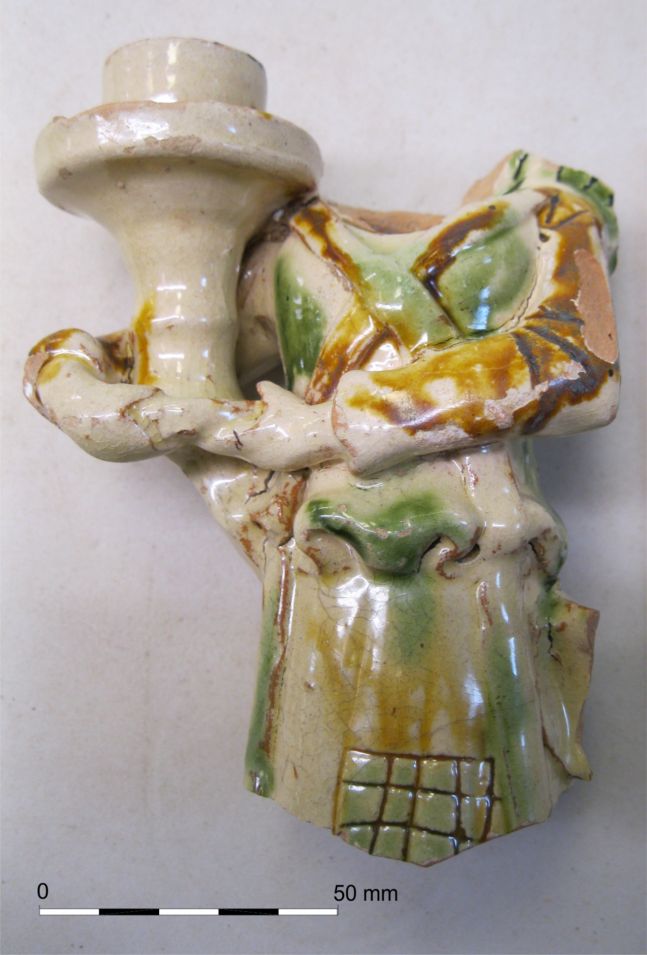 The object is in the form of a female figurine, holding the candleholder in her right arm; the head and base of the figure are missing. It is made of a pale red clay, covered in a white slip and a clear lead glaze mottled with green and brown. Slipwares were made at various centres across the West Country in the 17th and 18th centuries, for example at Donyatt in Somerset, but expert opinion suggests that this object is more exotic. The most likely source is France, and the date probably 17th century, although no direct parallel has yet been found. Our investigations continue, but one burning question remains – what was an elaborate imported candlestick like this doing on a 17th century, perhaps Civil War, military site in Wiltshire?