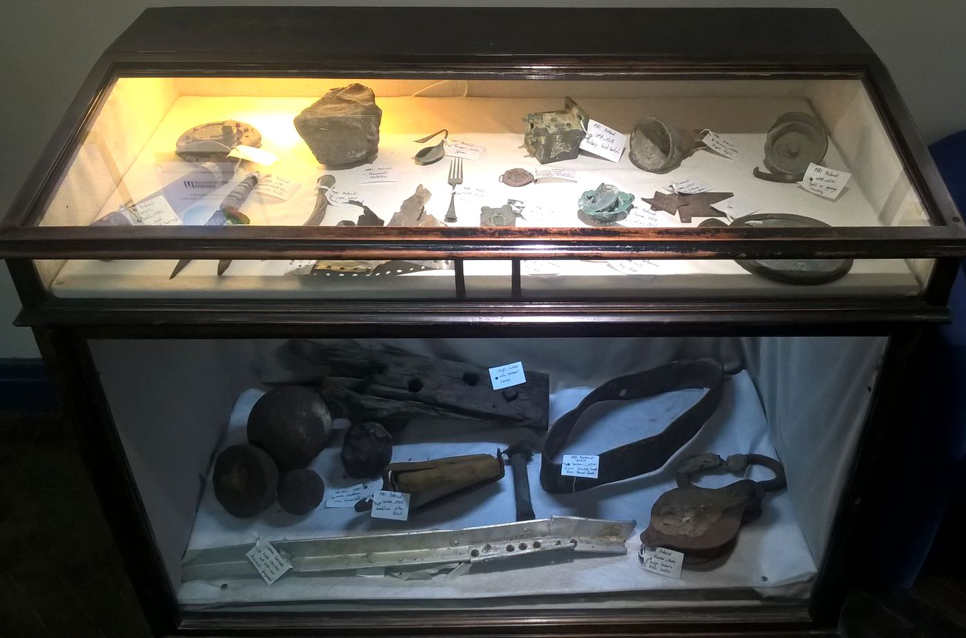 Also on a related note, the display case in the reception of our Salisbury office needed updating, so I spent a day putting together my first display cabine t showing off finds from the Coastal & Marine department. Using materials received from the Marine Aggregate Industry Protocol, the display was designed around showing the variety of objects and material types that we work with in the marine sector. The cabinet now contains: munitions (decommissioned!), past and present; objects of war; aircraft wreckage; prehistoric remains and a whole host of ships’ fixtures and fittings from throughout the ages. Creating this exhibition was an excellent insight into the mental process of piecing a display together, not only for visual effect but to make the display make sense to those who are viewing it.