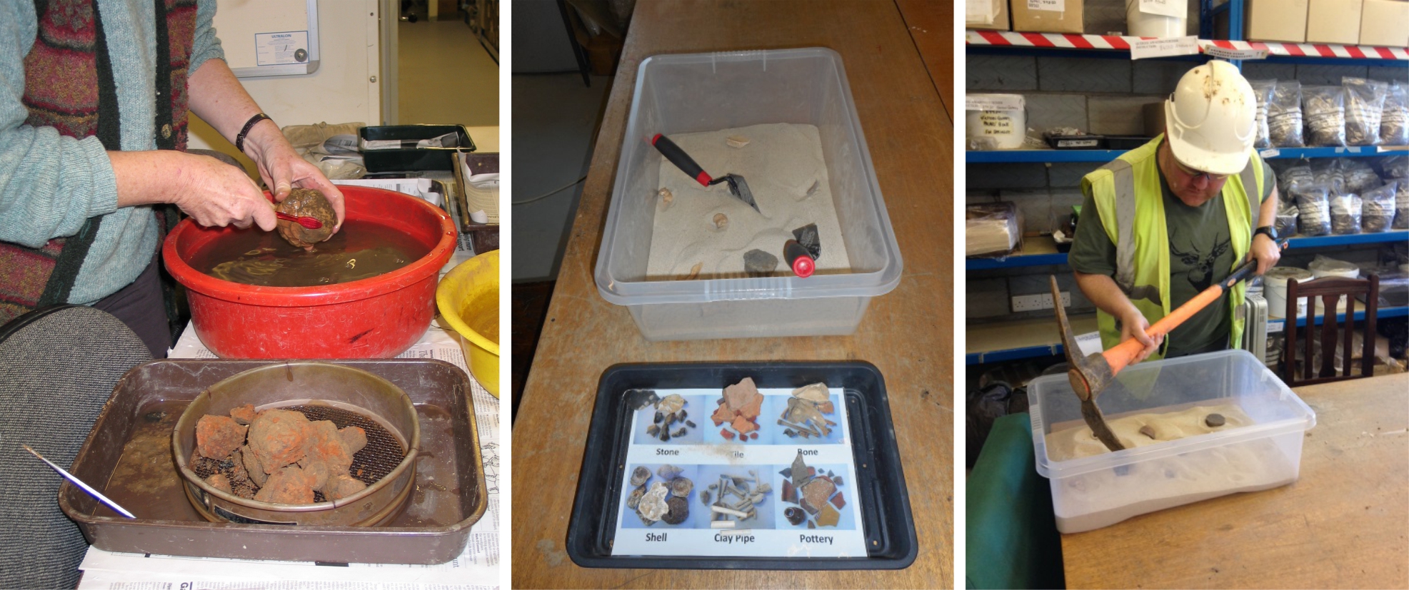 The sandpit excavation is not exclusively for children, adults can have a go too, as the photo shows, team leader Mark Williams carefully excavating Roman pottery – his choice of excavating implement may explain why he was ‘promoted’ out of the field!