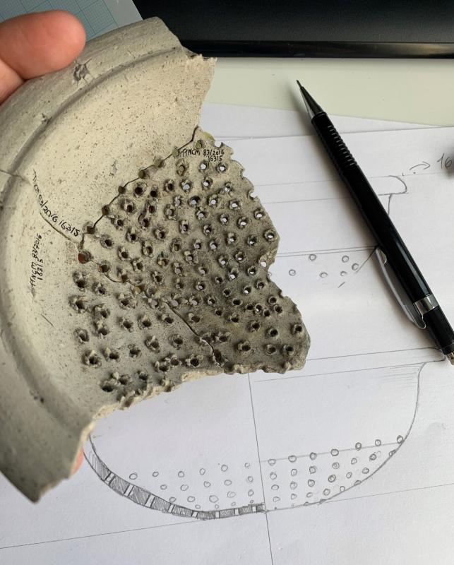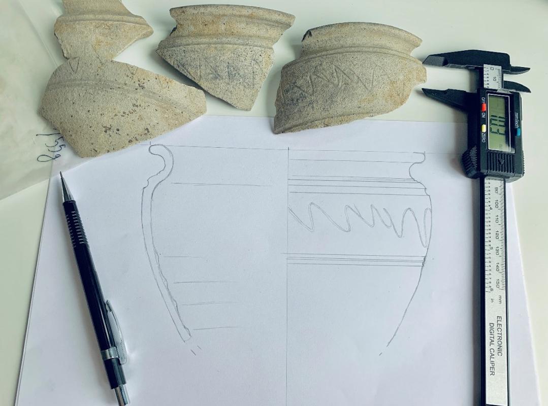 After lunch I come back to my big table to get some more drawings done, always checking carefully that all of the bags are in the right order inside of the boxes so I don’t get lost among the many sherds every morning! The order is very important in finds drawing, having a clear space on the table helps to avoid accidents and mistakes. Cleaning before and after is very important too, or even wearing a face mask as the pottery and other objects can be very dusty.