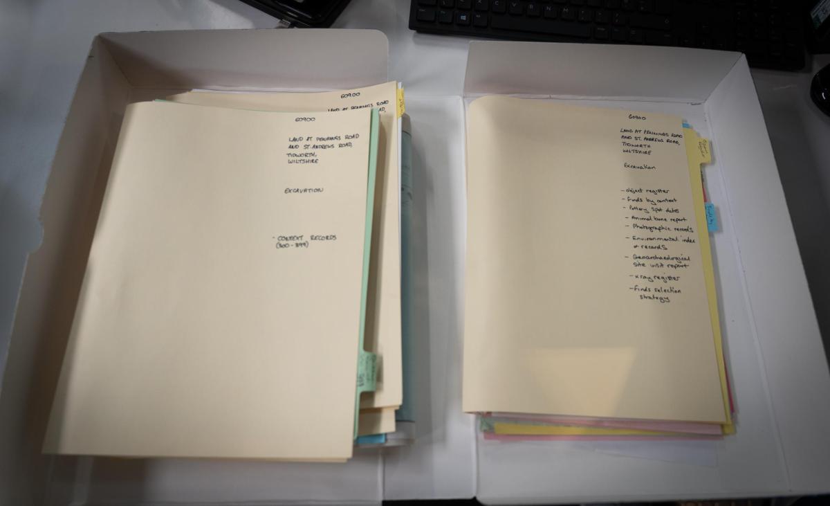 The archives at Wessex are prepared to national standard which are then tailored to each repository’s requirements for acceptance. These normally consist of ordering the physical paperwork in a certain order, storing any digital data with the Archaeological Data Service (ADS), and the finds in a certain way. What is included in the archive also depends on the repository and so sometimes I need to chase certain bits of paperwork that need to be included. This may be because they were removed so that they could be referenced for something. Occasionally I will have to create this from scratch as unfortunately it was not done at the time of fieldwork.