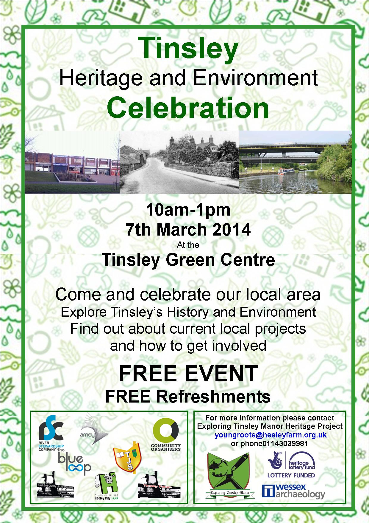 We will be celebrating the first birthday of the ‘Exploring Tinsley Manor’ project on March 7th, along with our partners Heeley City Farm and Tinsley Junior School, from 10am till 1pm at the Tinsley Green Centre in Sheffield.