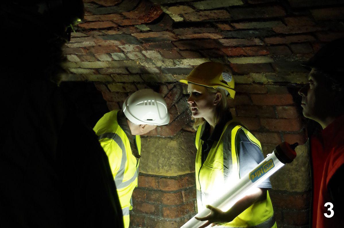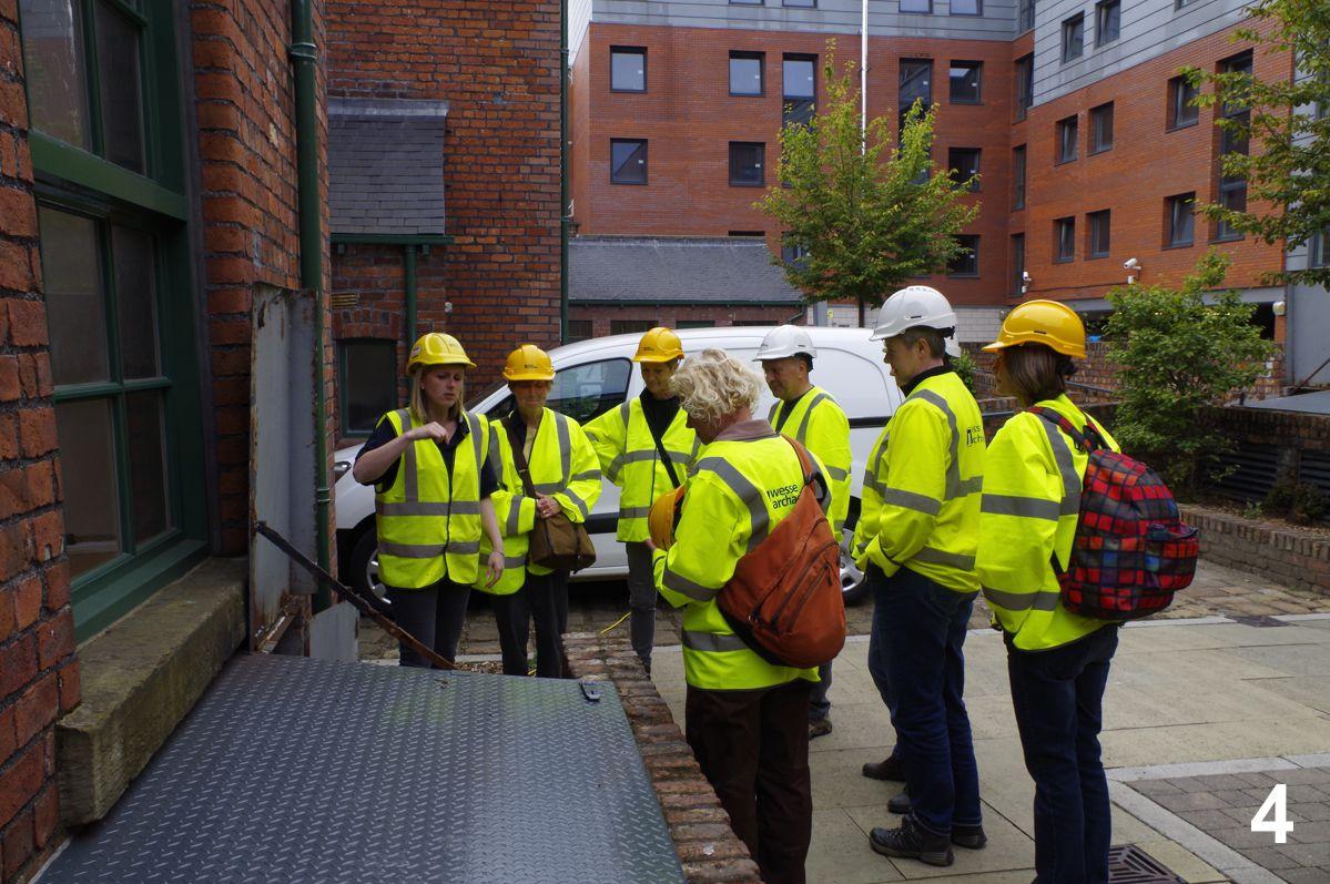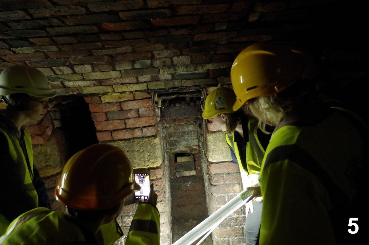 Further down the hill, Lucy Dawson, Built Heritage Project Manager, and Chris Breeden, Spatial Data and Digital Innovation Manager, were carrying out the important gas safety checks donning full breathing apparatus and setting up temporary lighting within the preserved and Grade II listed crucible furnace cellars at the former Titanic Works in preparation of the media heading to them after being wowed at Hollis Croft (pic. 3). The confined spaces of the cellars meant that only a small number of people were allowed within them at any one time (pic. 4).