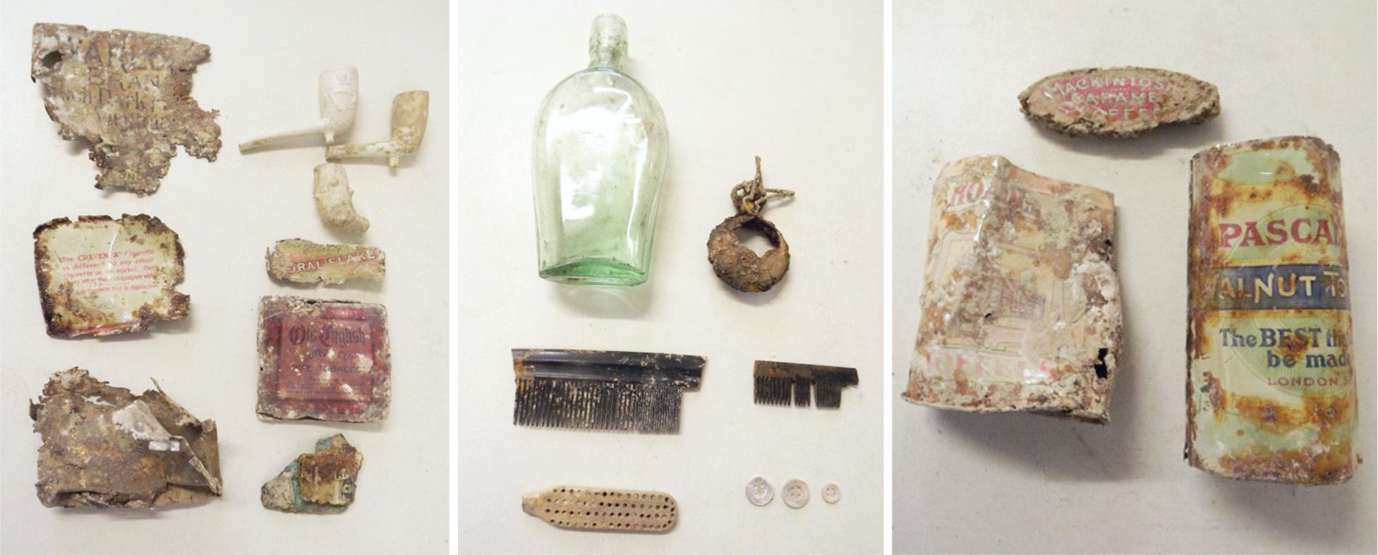 Besides the obvious activities of eating and drinking we have found plenty of evidence for smoking – pipes, cigarettes, tobacco and cigar tins. Some of these have survived in remarkably good condition enabling brand names to be distinguished. One of the clay pipes is of particular interest as it is Irish.