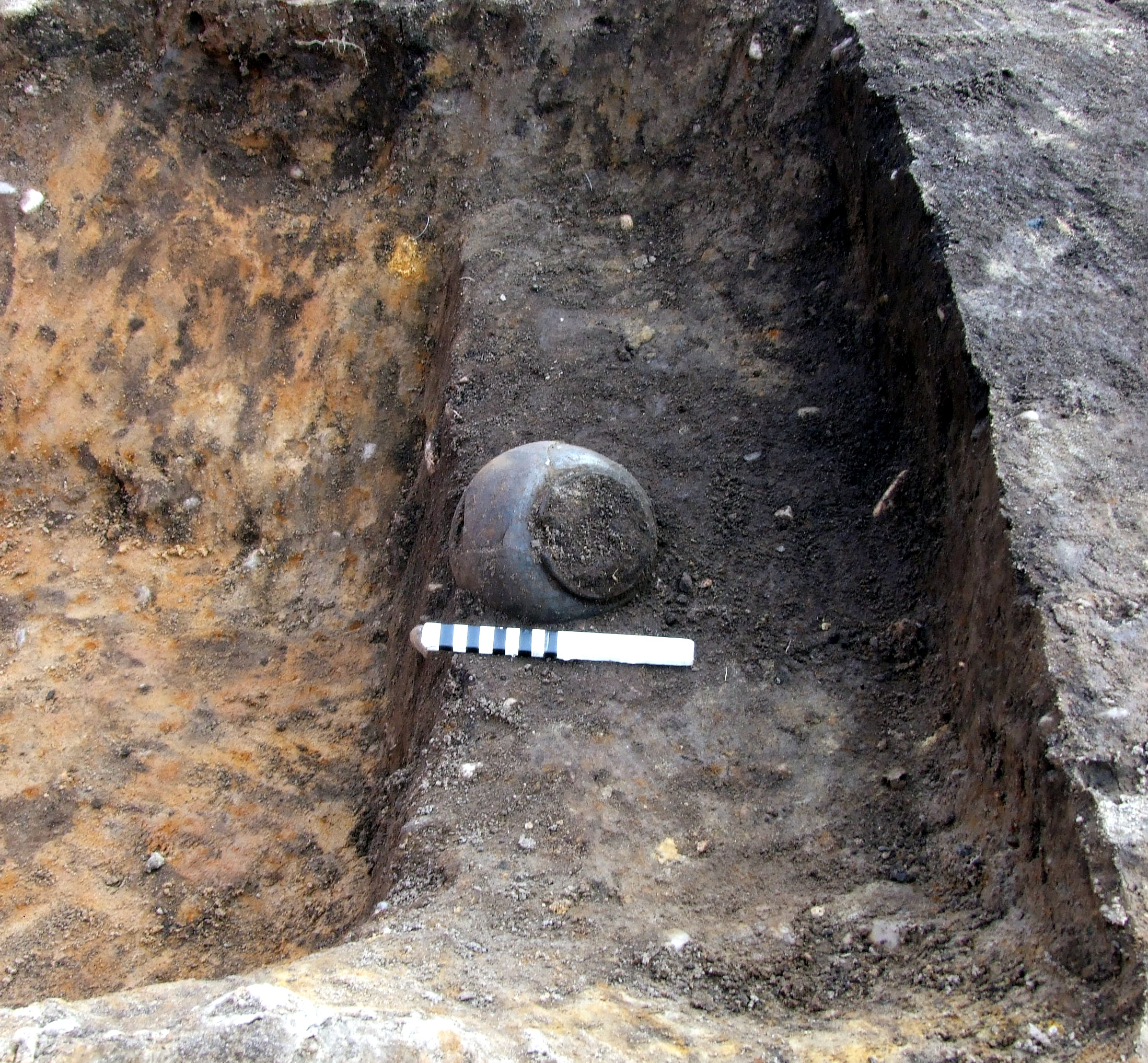 An area targeted on the surrounding field system only produced a complete everted rim beaker from either the Rossington Bridge or Blaxton Kilns, which is likely to date from AD 140 to the early 200s. The rim of the beaker appears to have been purposefully removed prior to deposition, but its fills contained no evidence of its function (left).