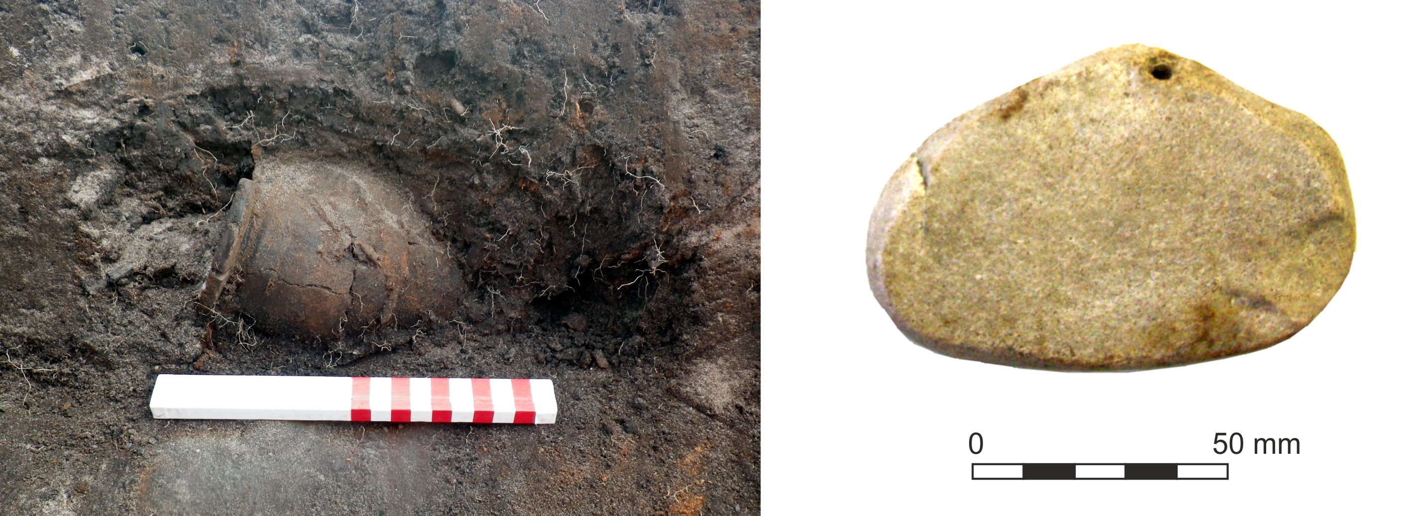 The fills of the surrounding enclosure ditch contained a complete probable TYPE E lid seated jar, from the Blaxton, Rossington Bridge or Cantley Kilns, dating between AD 140 and 180 (below). An unusual perforated stone was also recovered, which may have been used as a weight of some description.