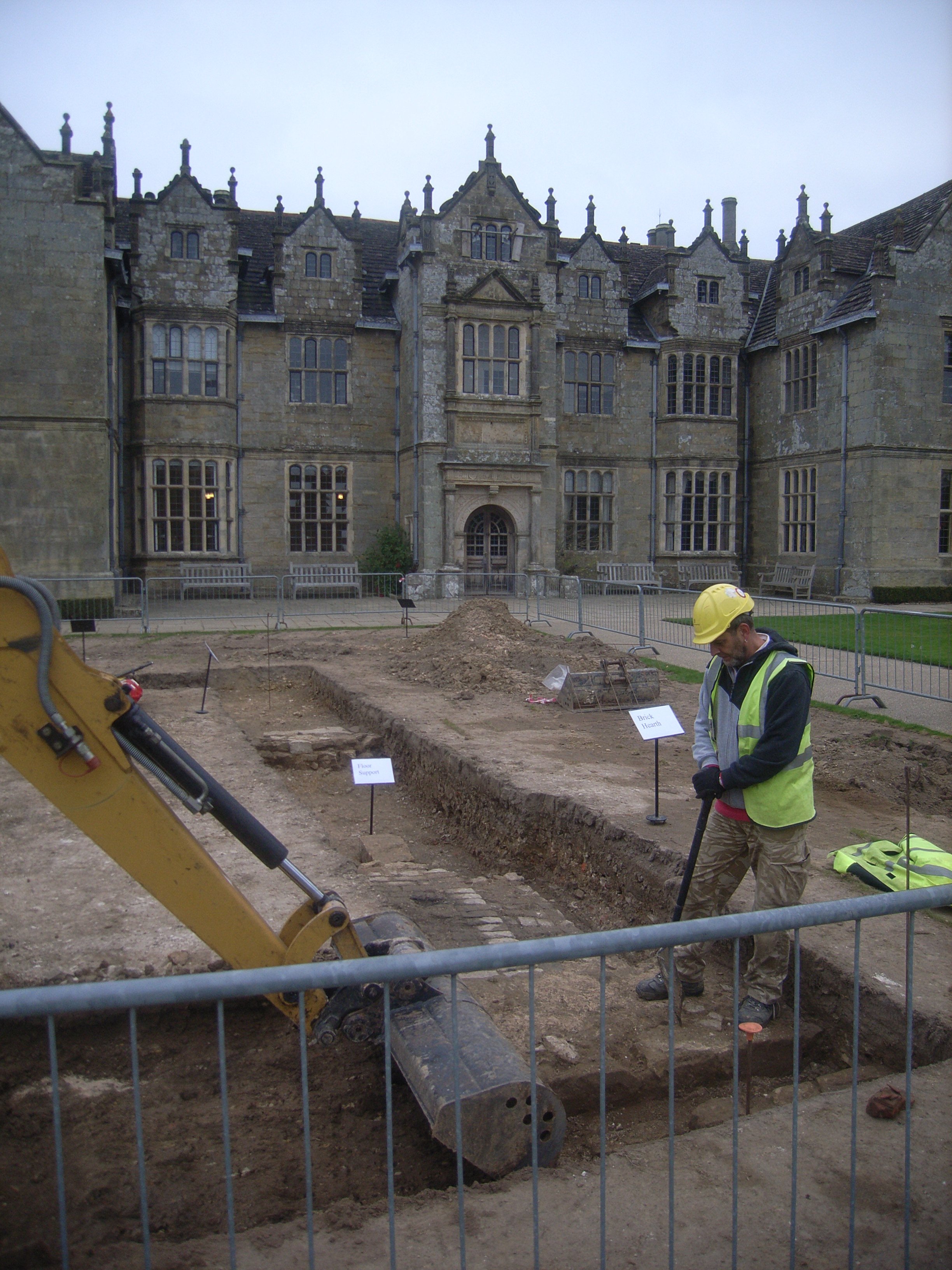 Following a programme of geophysical survey and the main survey and analysis of the buildings, a programme of archaeological evaluation trenching was carried out. This confirmed that the Elizabethan mansion originally had a south range, and revealed the stone foundations of the southern half of the west wing which was demolished in the mid 19th century. Earlier stone walling, a chimney base and a brick hearth of likely fifteenth or early sixteenth century date were also found, which showed that the earlier Wakehurst house had been situated immediately to the south of the Elizabethan one. Other features relating to garden landscaping were recorded to the south of the present mansion.