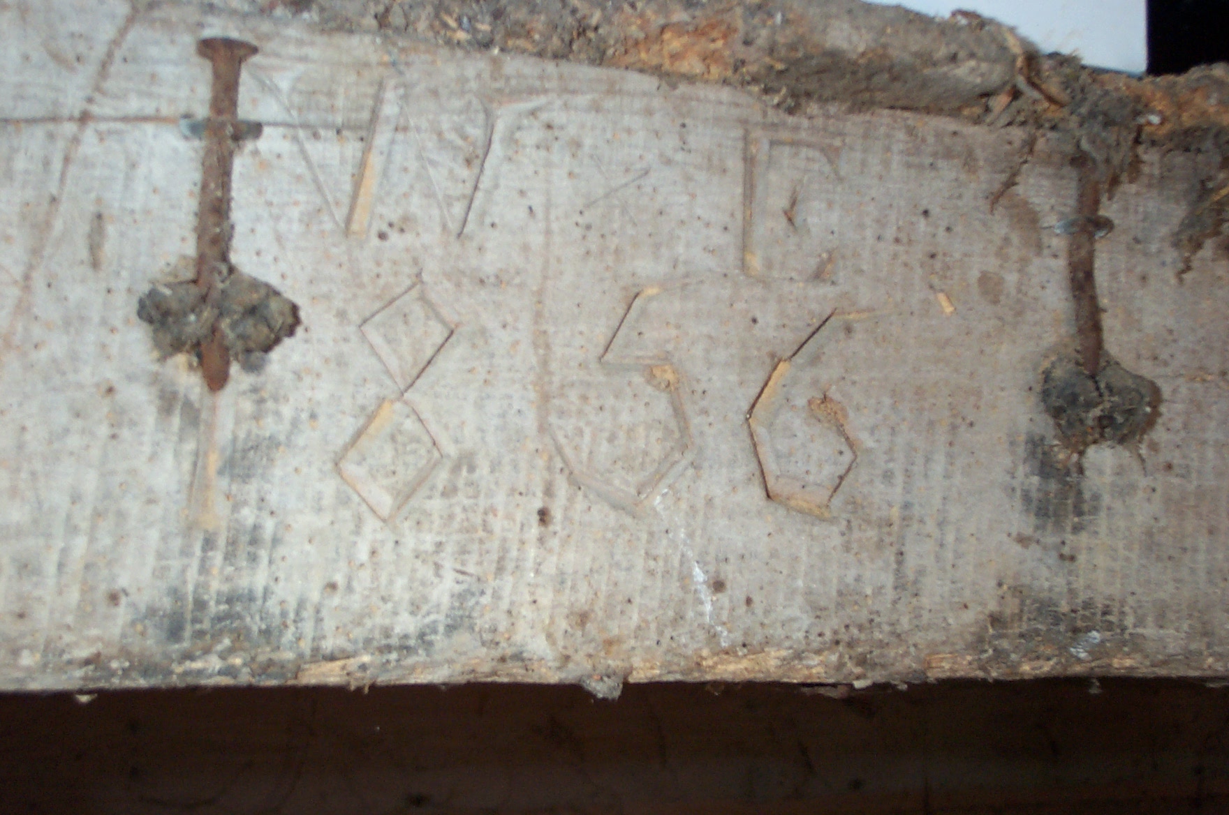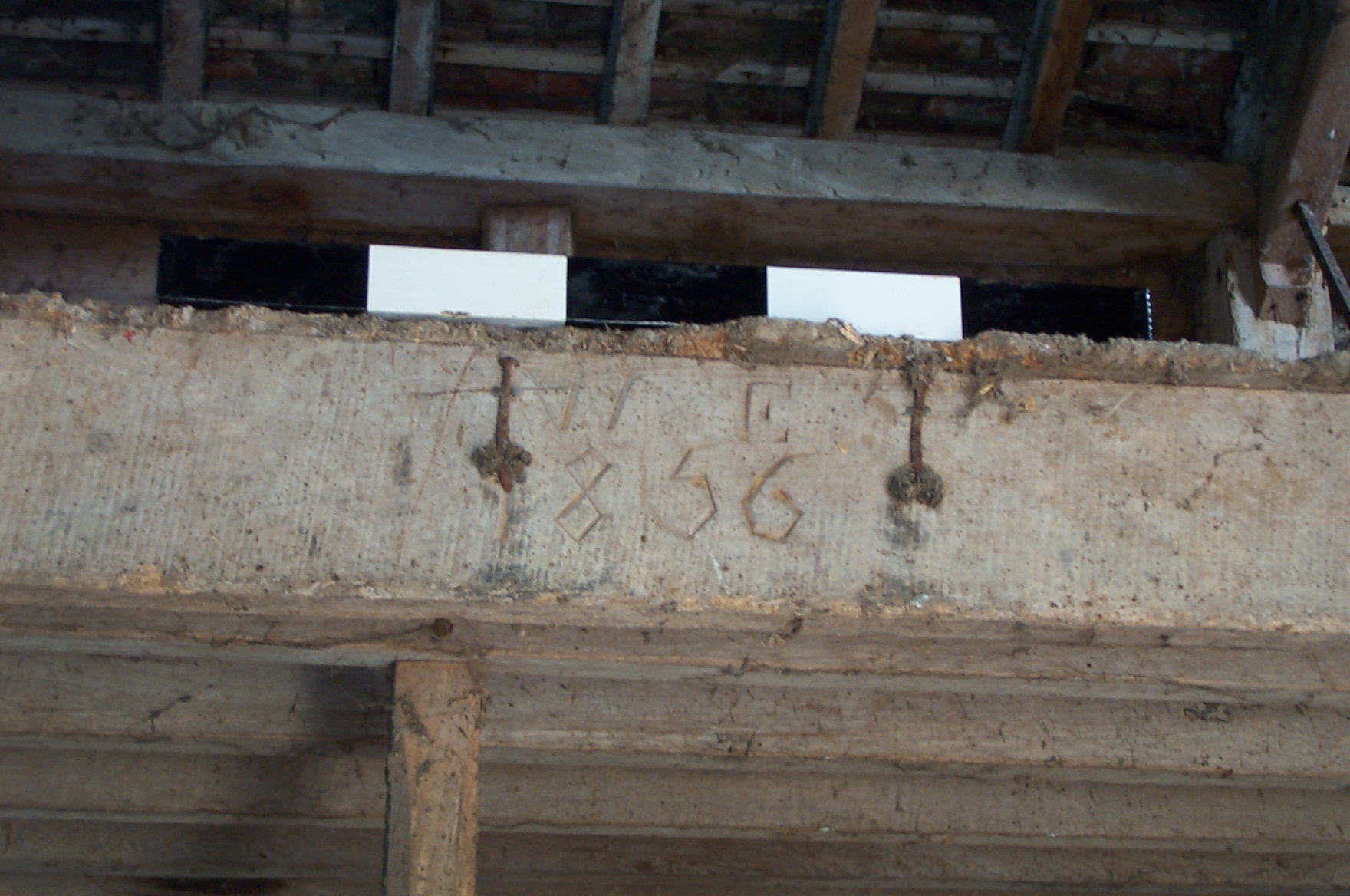 Images of the granary in its current location, including one showing the timber beam with the date 1856 and the initials of the builder carved into it, are posted here, for free download.