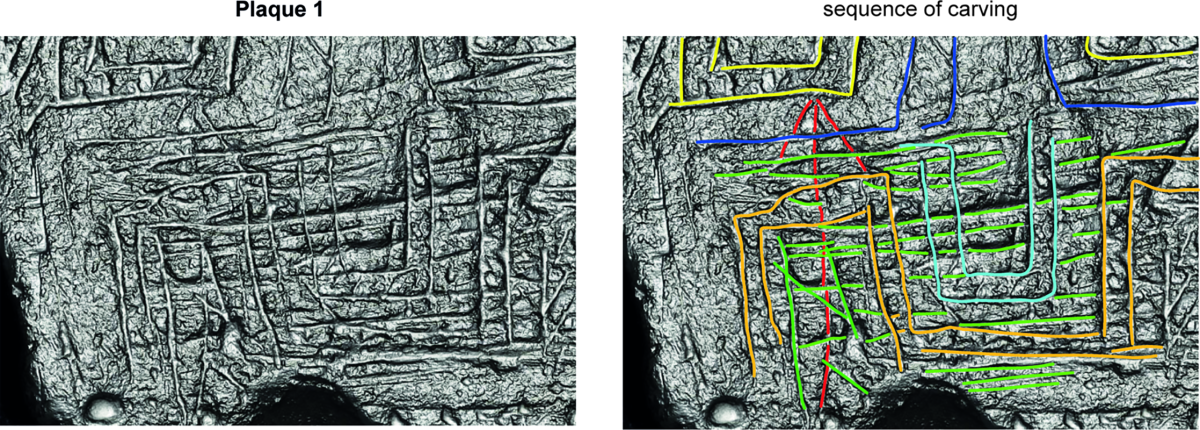 Above: Lower part of Plaque 1 showing (left) raw data under specular enhancement mode with (right) the engraved sequence highlighted in order of red, dark blue, yellow, green, light blue and orange.