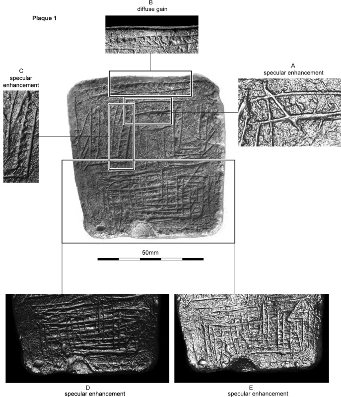 Above: Plaque 1 upper face showing details and features under RTI