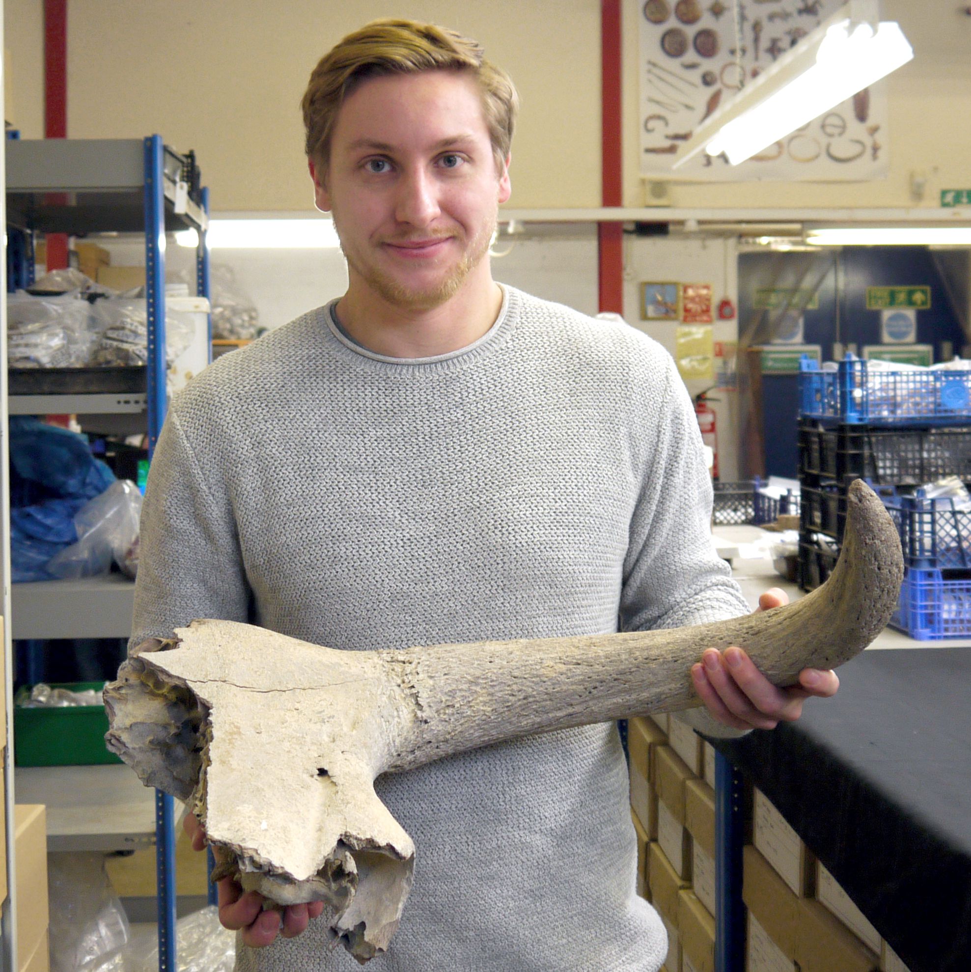 Availability of aurochs skulls for study has been surprisingly good; Ewan has had double the number he initially thought he would have access to. He estimates by the end of his research he will have recorded between 30−40 skulls. Another positive for Ewan has been the variation in skulls both spatially and temporally, which will allow him greater analysis. One problem he has faced though is that many of the skulls are unstratified which makes absolute dating harder, however often they can still be dated to broad periods such as the Holocene or Pleistocene.