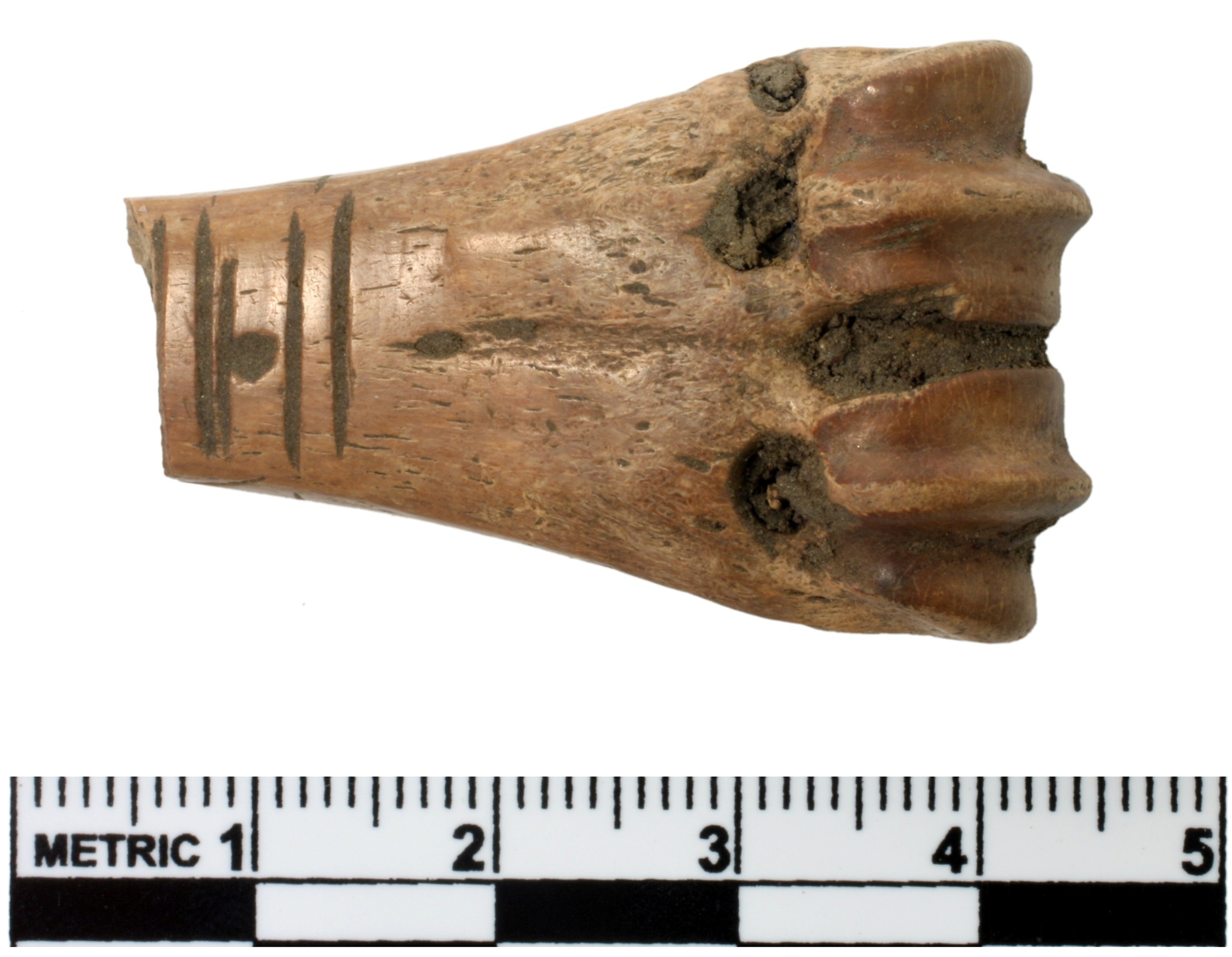 So, what are the other prize finds so far? Well, there’s a beautifully polished and decorated handle from a shuttle tip or gouge, made from the lower limb bone of a sheep or goat (skeletally, these species are very difficult to tell apart), which is probably slightly earlier, of Iron Age (700-1 BC) date.