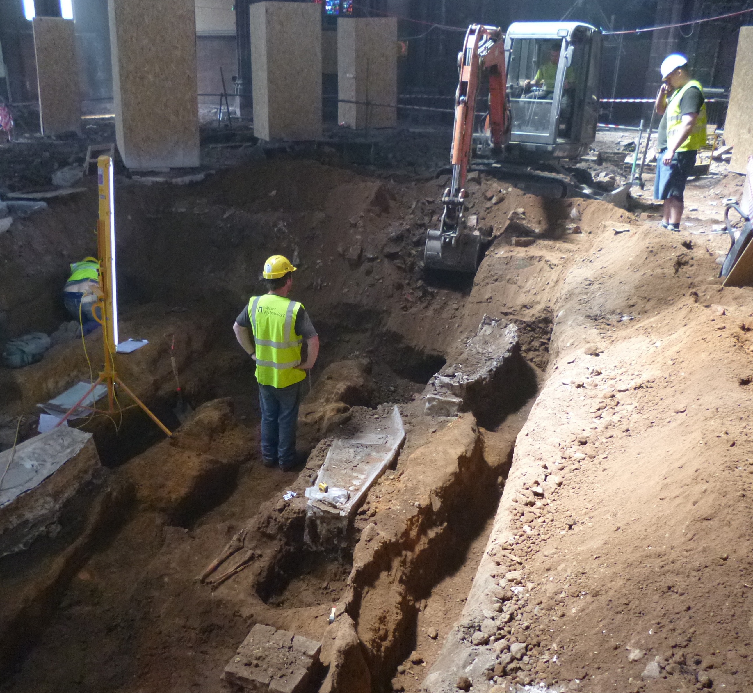 In April and May a team from the Sheffield Office carried out the excavation of a 7 m by 7 m  trench within the nave of Manchester Cathedral in advance of the construction of a raisable dais. The work was carried out on behalf of Lambert Walker and with help and advice from Norman Redhead (Cathedral Archaeologist) and Dr Peter Arrowsmith. Five lead coffins and 49 inhumations were revealed during the excavation and watching brief. The high status of the burials was notable and contrasted well with the individuals seen during our recent work at Wakefield Cathedral. As well as the lead coffins, items of note included ornate coffin fittings and decorative wooden coffins.
