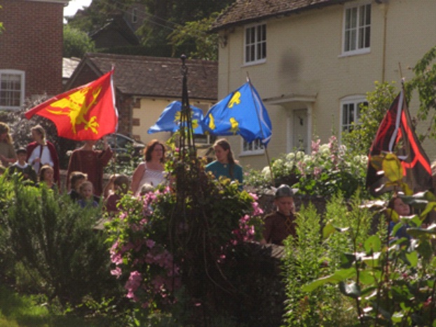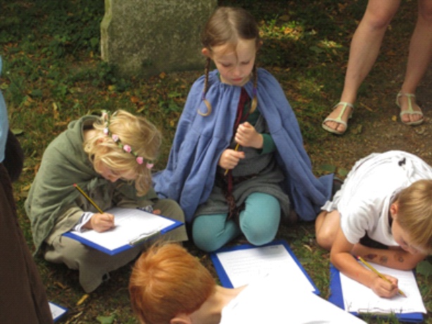 The intrepid band of Saxons march from their school through the villages to visit Corhampton Church, built in 1020 AD, where they are given Saxon names for the day, are told stories from the beautiful wall paintings, study the sundial and measure the girth of the yew tree in the churchyard, which predates the church.