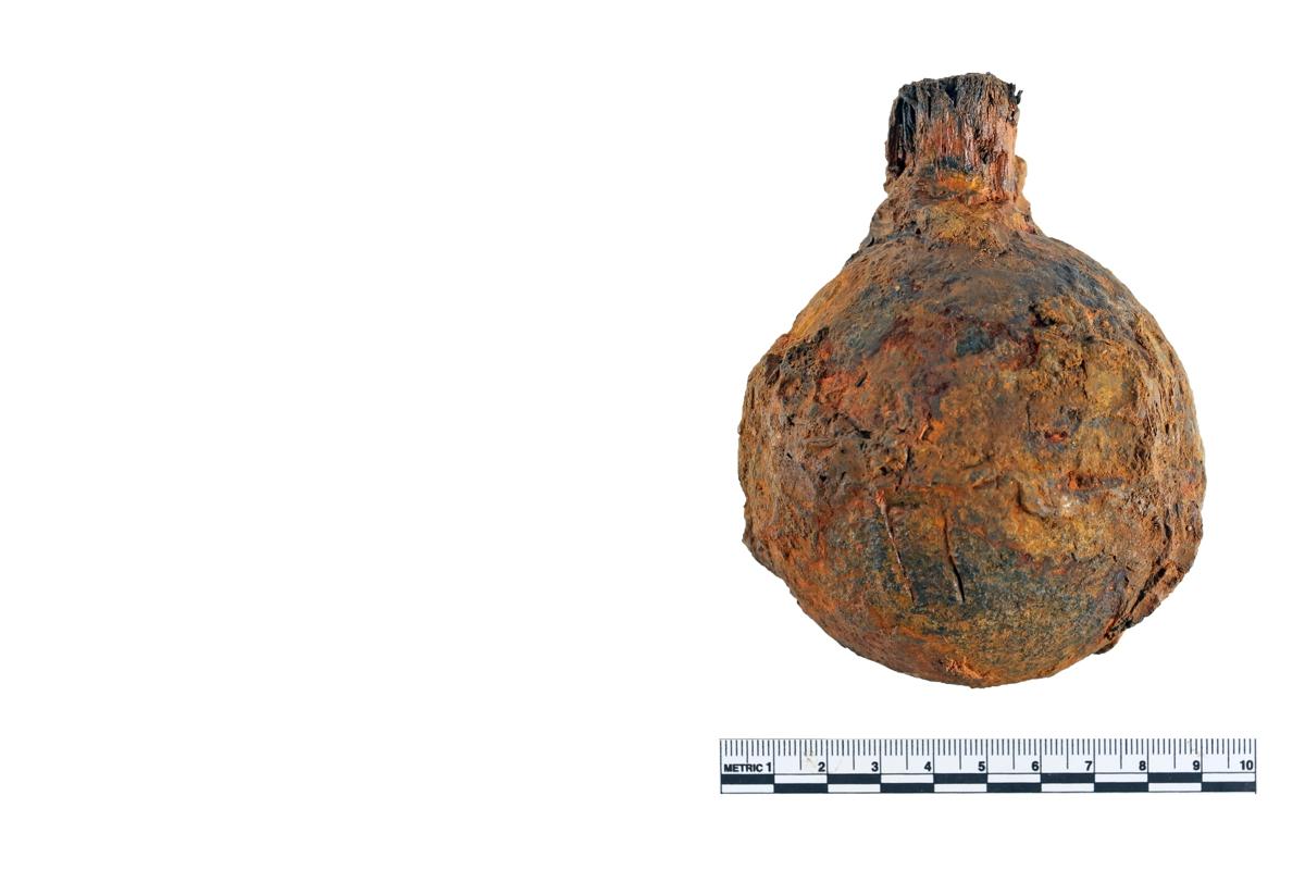 The grenade is spherical and made of cast iron with its fuse still intact. The first grenades were small iron spheres filled with gunpowder fused with a length of slow-match. These types of grenades weighed around 1.5 kg and were equivalent in size to a four-pound cannonball (Crowdy 2015). These types of hand grenades were used during land combat and on Naval vessels. One of the more common munitions aboard warships during the late 18th century and early 19th century was the hand grenade, used for close quarter action. Examples were recovered from HMS Pomone that also had their original fuse in place (Henry 2004). Hand grenades of this kind were used during the Napoleonic era (1799−1815) and were used by both the French and British.