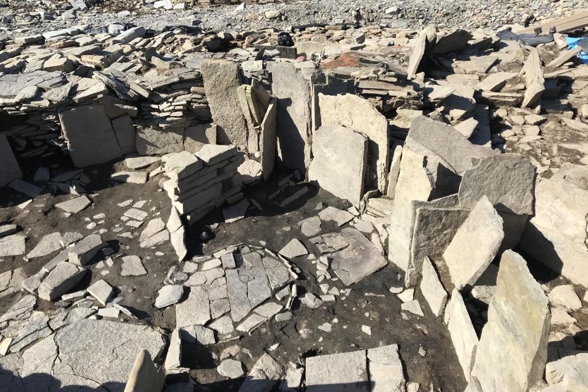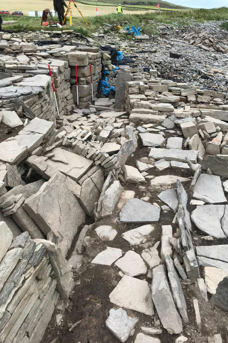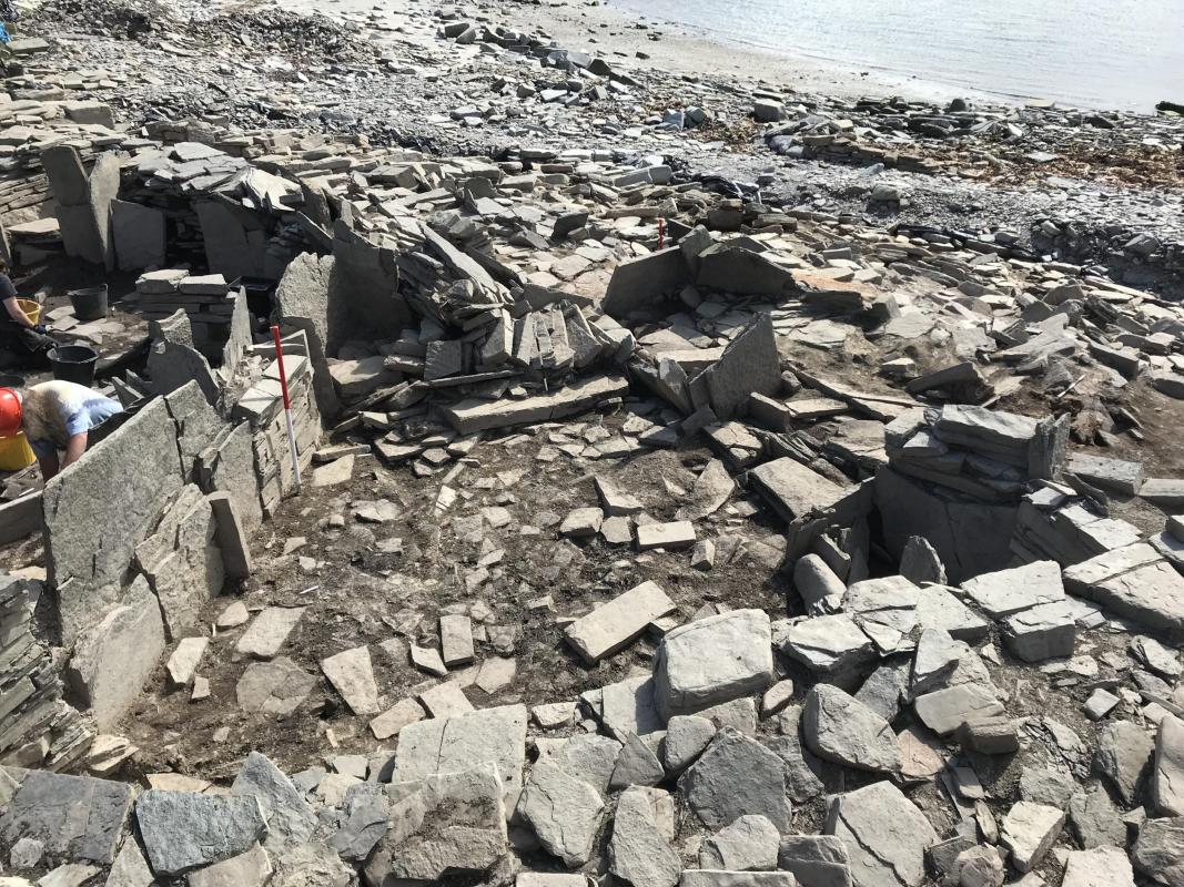 Investigations commenced in 2010, focusing on the portion (approx. 1/3rd) of the site which lies on what is aptly named a storm beach. The summer neep tides lap against the base of the monument, which now rests below the level of the adjacent beach, but the winter storms see waves lashing up to the grass level, as demonstrated by the kelp and sea plastics lying over the upper cell I so carefully excavated three years ago. Each year, a little more of the site is lost to the sea; the outer wall of the earliest phases of the monument (potentially a Neolithic chambered tomb) had already gone last time we were here in 2019. In the three intervening years, the sea has taken a heavy toll with the loss of further parts of the monument’s massive outer wall and marked slumping of other walls within parts of the monument up-slope.