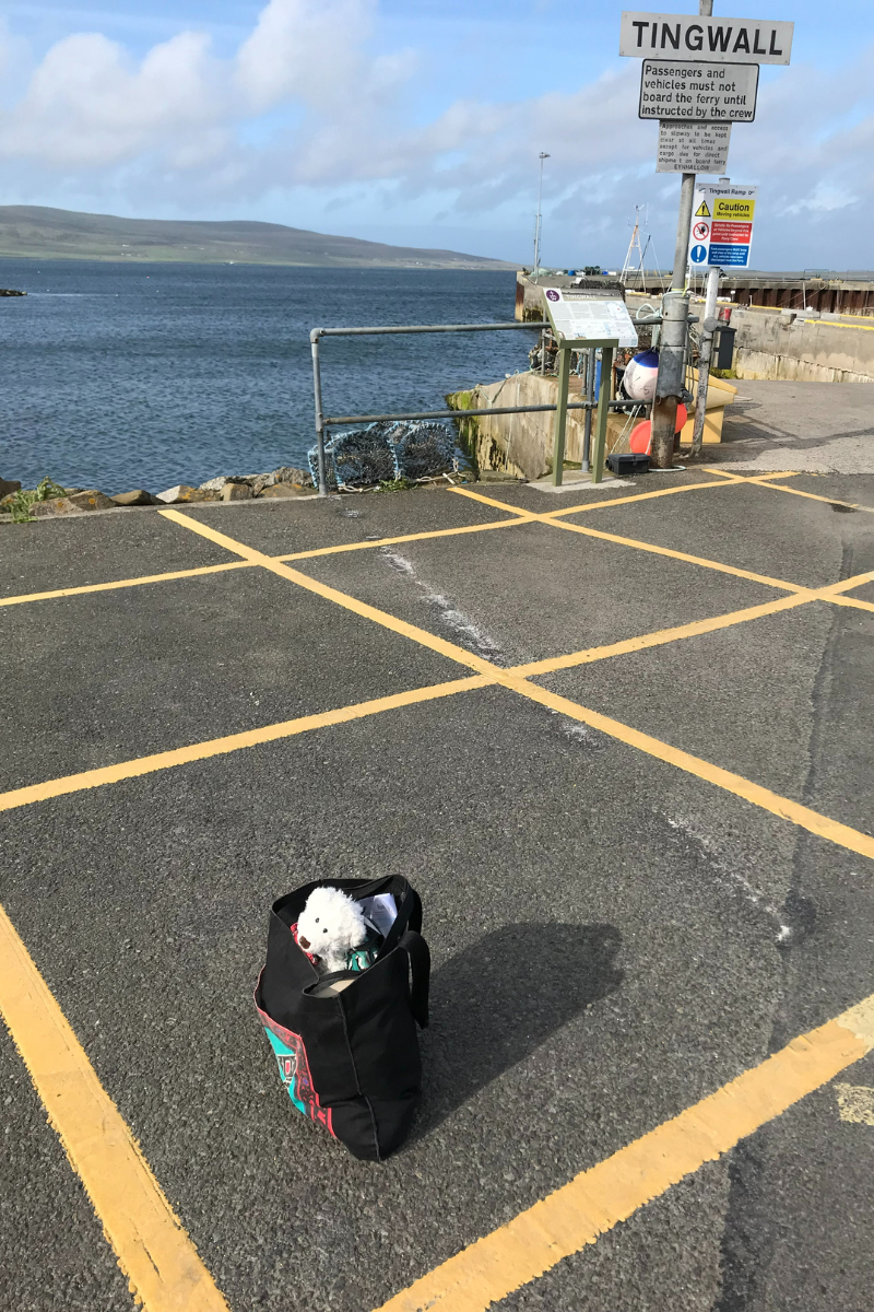 Above: Left - Waiting at Tingwall for the Rousay ferry, sans luggage and - Right - Structure 5 from the east, with the storm beach beyond (Mainland Orkney beyond)
