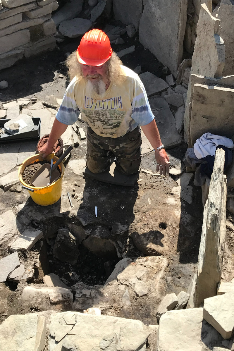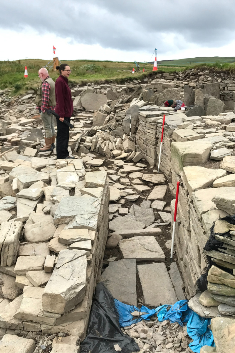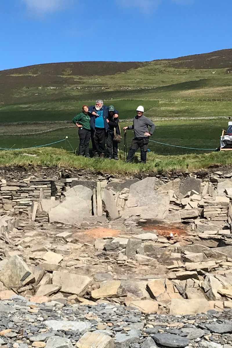 After a seemingly interminable three-year hiatus (has it really been that long? … COVID-19 hit before the 2020 season) I finally got to return to the archaeological glories of Rousay with my esteemed colleagues (& long-time friends) Drs Julie Bond and Steve Dockrill of Bradford University to tread the stones of Swandro. The observant amongst you might note my apparent lightness of travel whilst awaiting the Rousay ferry at Tingwall, having arrived in Orkney whilst my luggage languished at Heathrow. My first day on site involved wearing a variety of donated clothing (including some rather roomy trousers belonging to my friend Keith, an experienced volunteer and professional re-enactor) whilst wielding Julie’s trowel – thank goodness I wore my digging boots to travel.