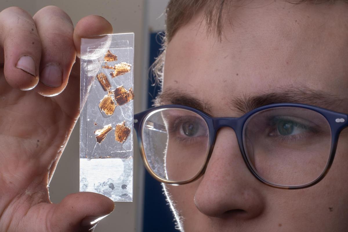 Ed Treasure at Wessex Archaeology inspecting Bronze Age wooden fragments under a microscope. Credit: National Trust, Steve Haywood.