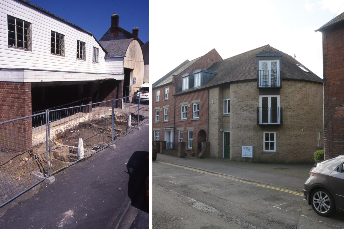 The site in Greencroft Street during excavation in 1999 (left) and in 2020 (right)