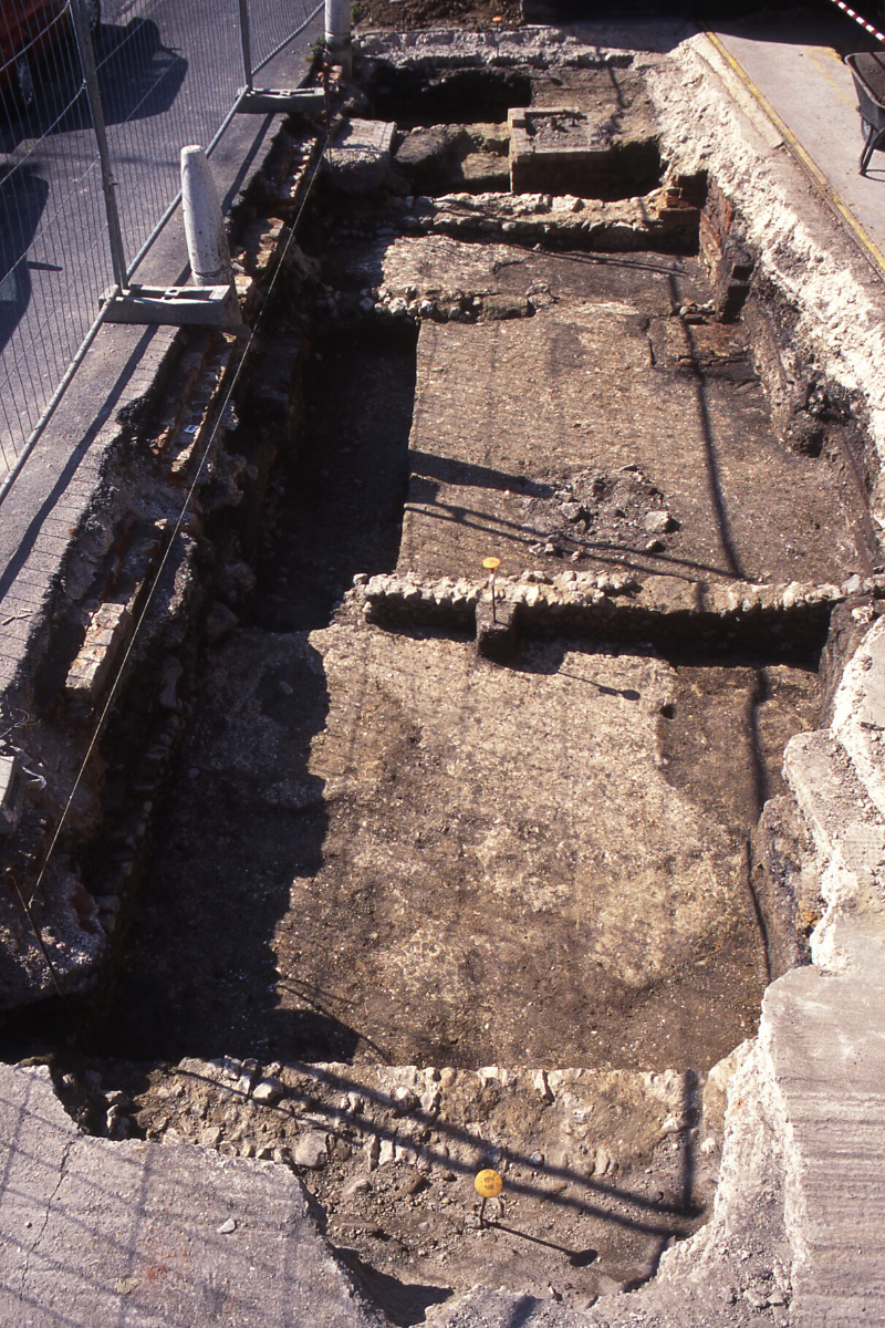 The foundations at the south end of the excavation were extremely fragmentary and difficult to reconstruct but represented traces of a wall base with parts of a clay and mortar floor. The remains to the north had also been heavily cut away by later buildings but survived in sufficient detail to define a structure that measured approximately 4.5 x 5m. A pair of parallel wall foundations, approximately 1m apart, probably formed part of a passage which gave access from the street to the land at the rear. The wall foundations were all made of roughly coursed flints, bonded with mortar and with isolated blocks of Greensand.
