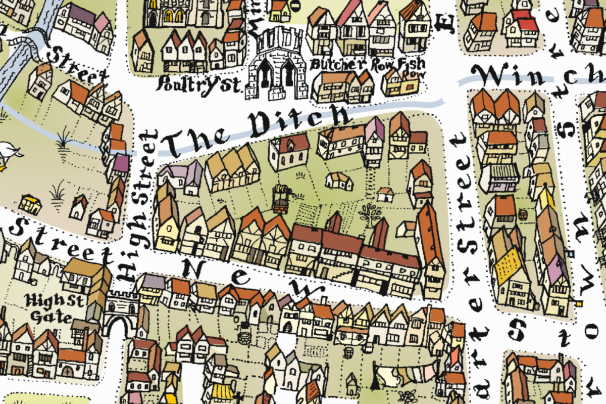 We next move to Trinity Chequer, a block of land that has been subjected to more separate archaeological investigations than any other chequer in the city. Despite the potential that this chequer provides for reconstructing the structural appearance of the medieval city, we begin our visit, not on a street frontage location but by focussing on the ‘back-lands’. We have seen from other excavations in the city that these ‘back-lands’ were formed of accumulated grey garden soil, which was nourished by the addition of domestic organic waste and night-soil. Pottery and other artefacts indicated that this process continued over many centuries. By 1997, when this small excavation was undertaken, the view was established that the ‘back-lands’ comprised small garden plots, while supplementary documentary sources included descriptions of areas with racks for drying woollen cloth, which was produced in large quantities throughout the medieval period.