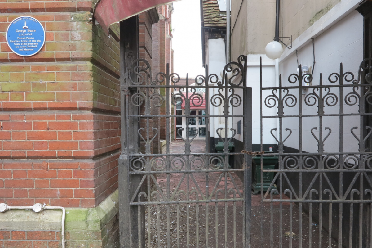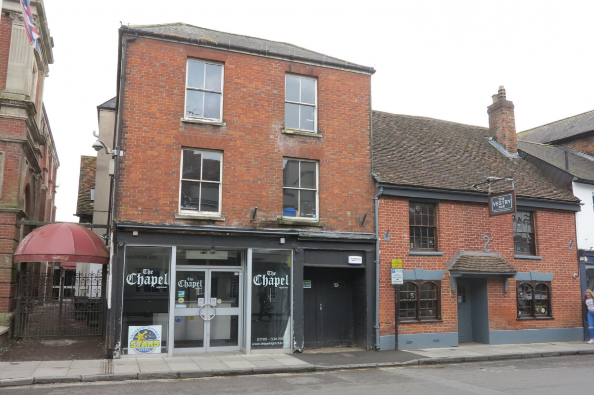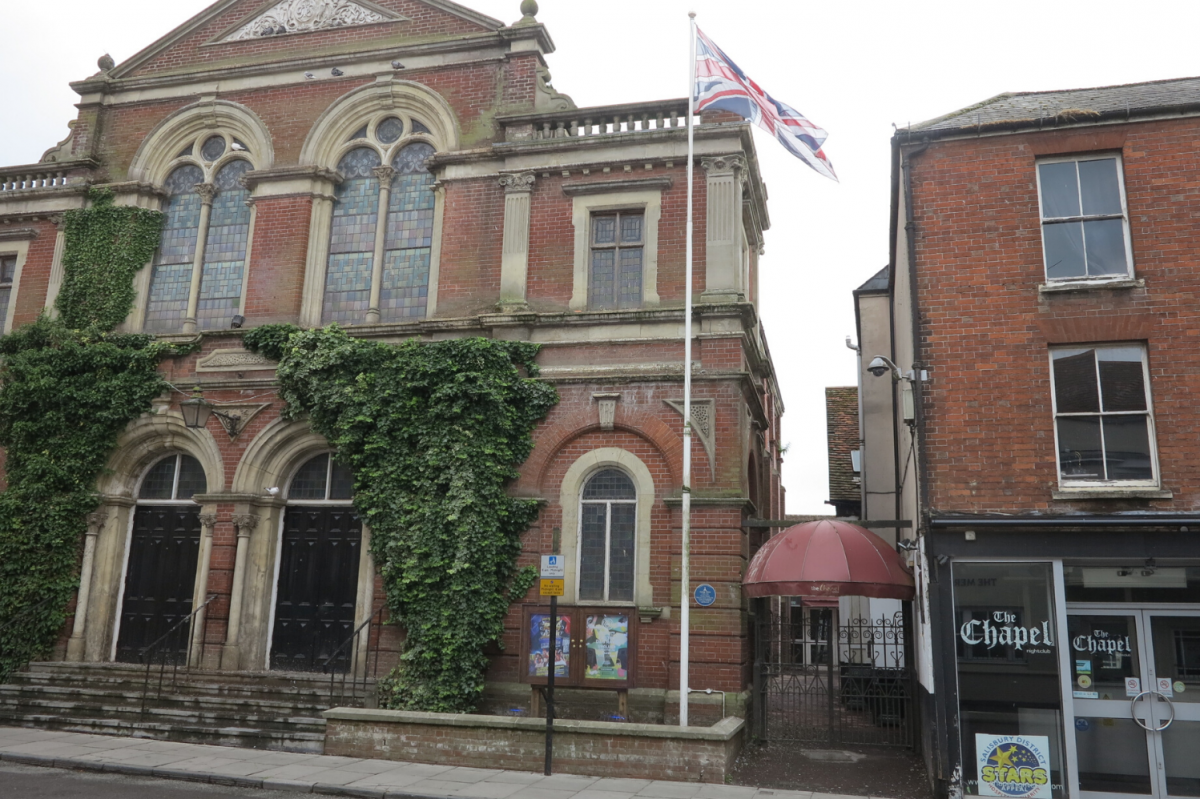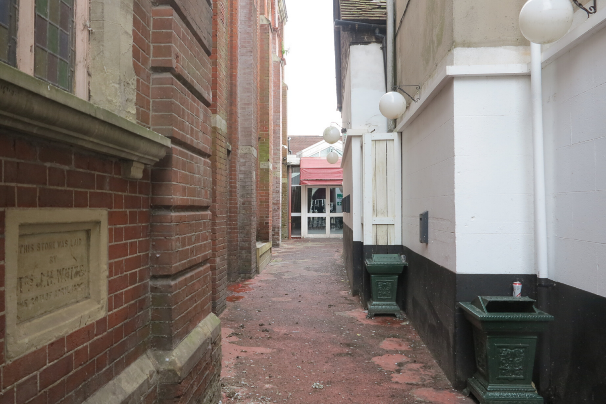 The Elim Chapel (left) and No 32 Milford Street (right), seen in 2020. The excavation site is beyond the alleyway covered by the red awning