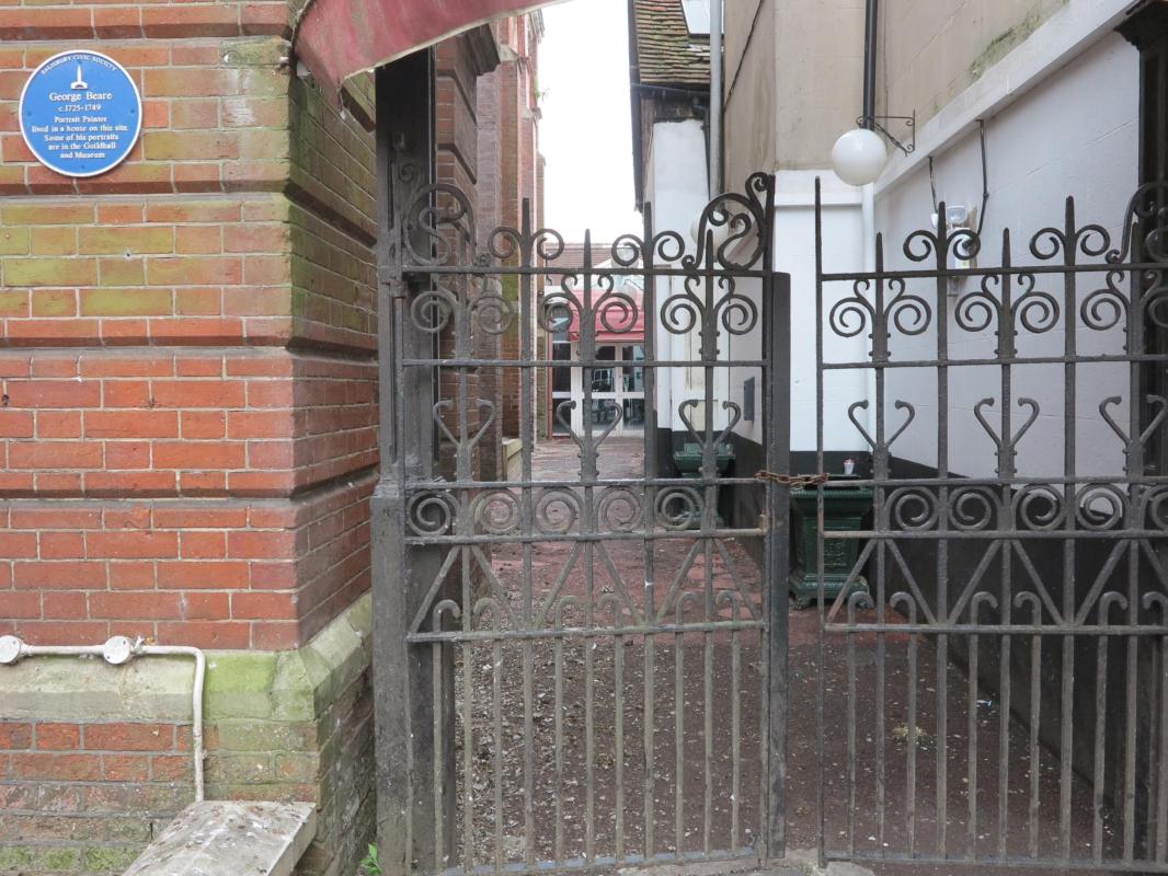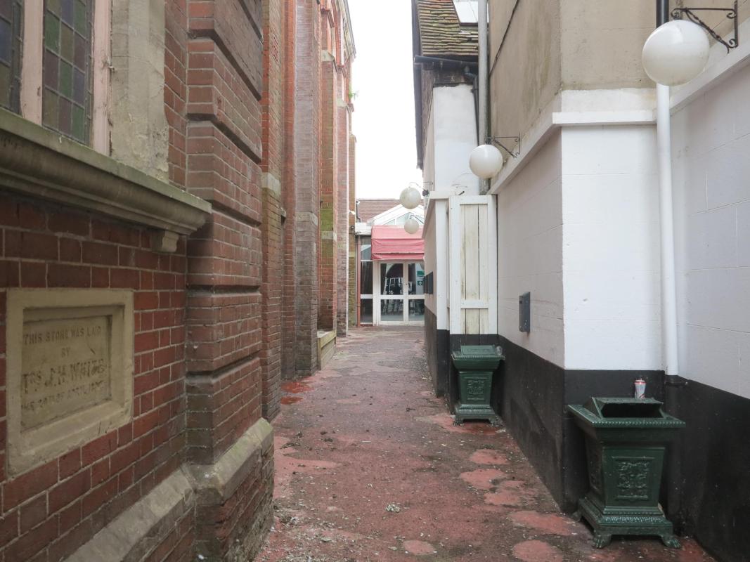 A closer view of the excavation site; the trench was situated beneath the building at the end of this alleyway