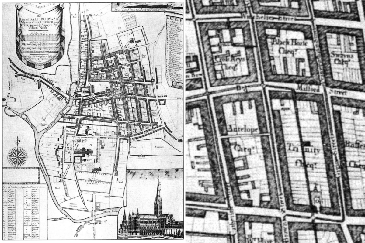 The consistent patterns of building design, which we have seen from repeated excavations, show how well-preserved building footprints in one site in the city can often be applied to other locations where the evidence is less well preserved. Naish’s survey of 1716 also provides tantalising hints of standardised construction. This invaluable record of the medieval city lacked detail, but nevertheless distinguished between buildings around the Market Square in the Cross Keys Chequer which were shown with courtyards and those in outlying chequers, including Trinity Chequer, which were depicted as single terraces (below).