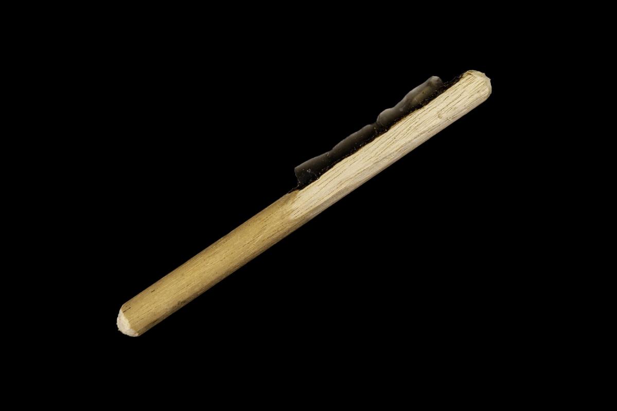 Modern reconstructions of Mesolithic flints, showing microliths used as drill bits (left) and arrow heads (centre), and blades used as knives (right). These examples show how small flints can be attached to wooden handles using natural resins
