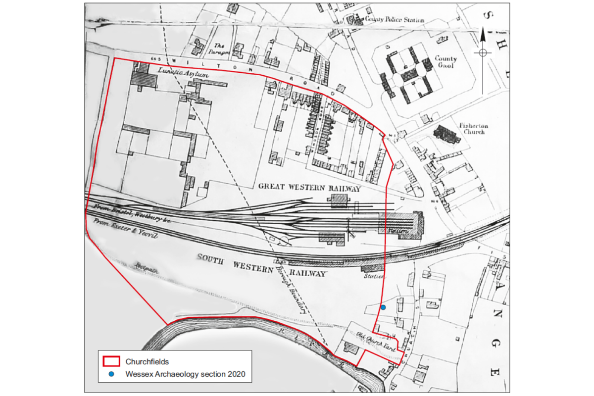 Extent of Churchfields and Victorian development as shown by Board of Health mapping (1860) and location of Wessex Archaeology's 2020 section (Map © Wiltshire & Swindon History Centre, reproduced with permission)
