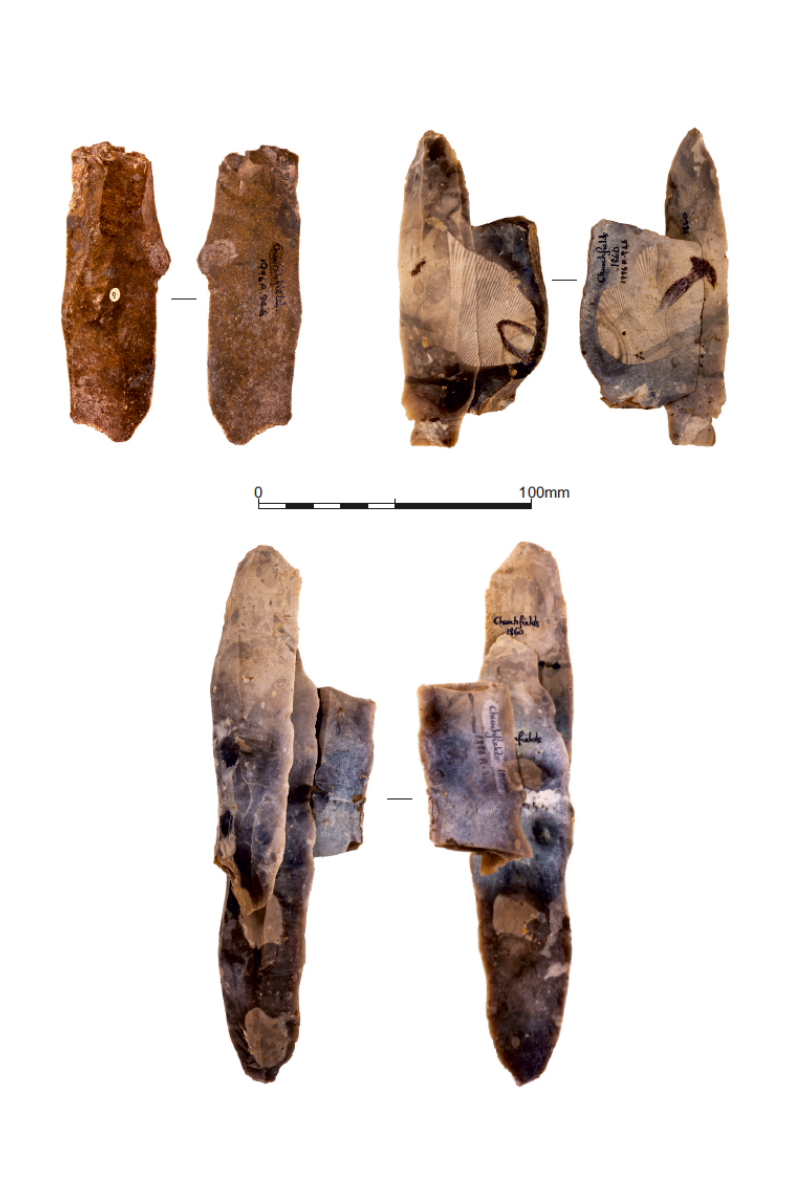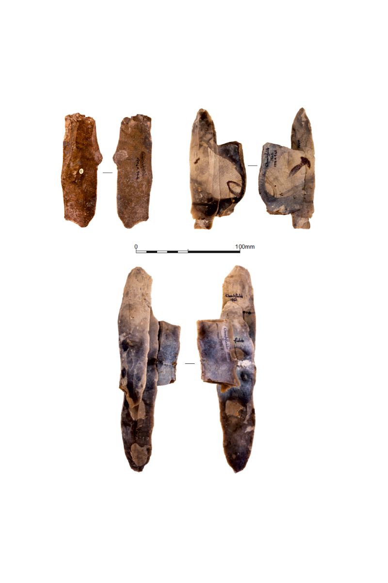 Collection of principal objects from Churchfields, showing blade of Greensand chert (top left) and refitting flint blades (top right and bottom)