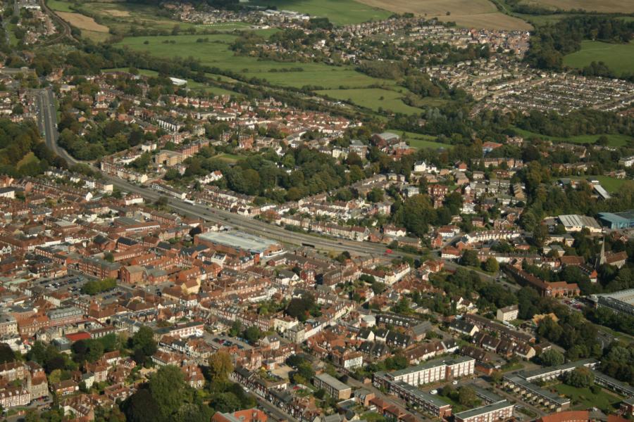Milford Hill ridge, framed by the inner ring road (left), the River Avon (bottom), and River Bourne (right), with Godolphin School at the centre