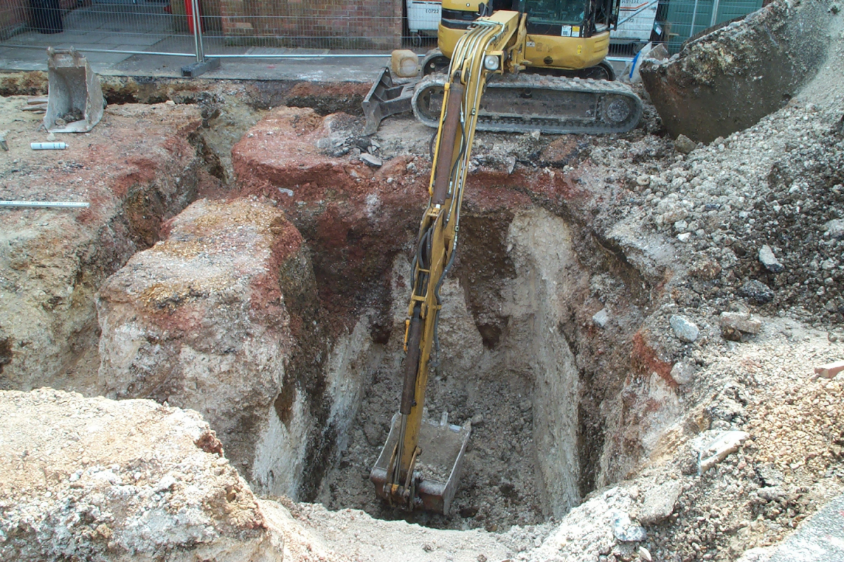 Excavations at the Godolphin School (left), near the edge of the gravel, and at the former Youth Hostel (right), where the deposit is thicker