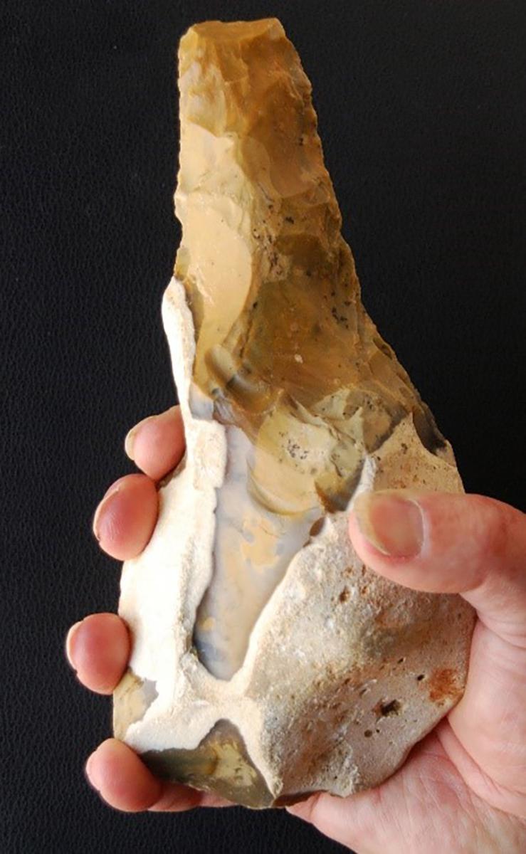 These observations helped to resolve the story of Milford Hill; however, relatively late on in the project at Godolphin School I was watching a machine digging a foundation trench when I spotted a large flint object that demanded to be investigated. True enough it was a hand axe, probably the first to be discovered on Milford Hill for over 100 years. Discoveries like that do not get much better.