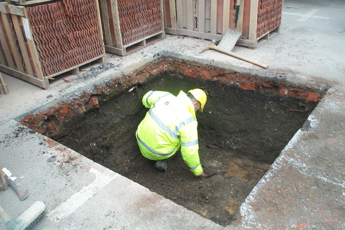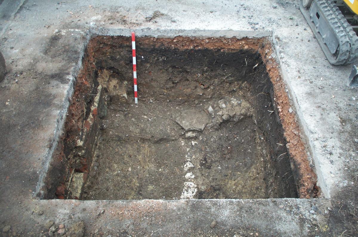 Test Pit 3 proved to be the most productive. It revealed a series of wall foundations, including two parallel foundations that may have formed a back alley, which intersected with foundations of a tenement property boundary. These wall lines were all constructed using chalk or flints and were probably of medieval or early post medieval date. One foundation was rebuilt using bricks, therefore perpetuating the line of the property boundary into more recent times.